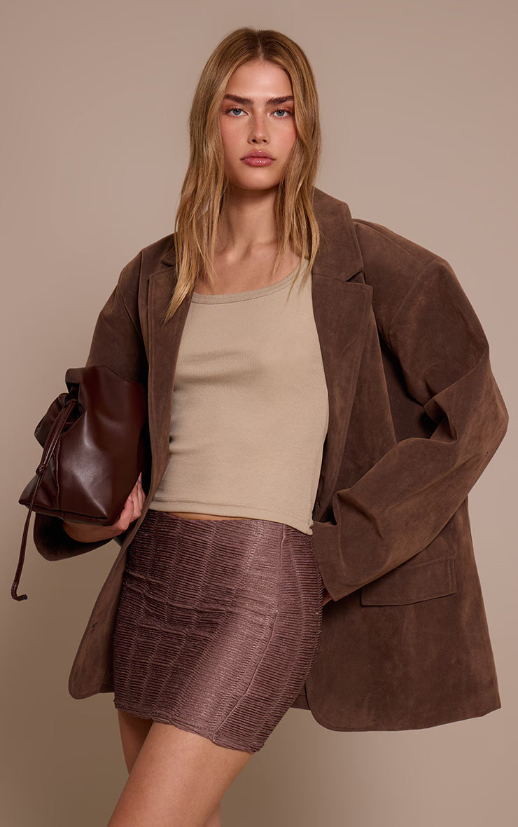 Keep your look chic and versatile with the mushroom textured jersey mini skirt. Made from textured jersey in a mushroom tone, this mini skirt is fitted to flatter and perfect for layering. Style with a crop top and heeled boots for a simple yet elevated finish.