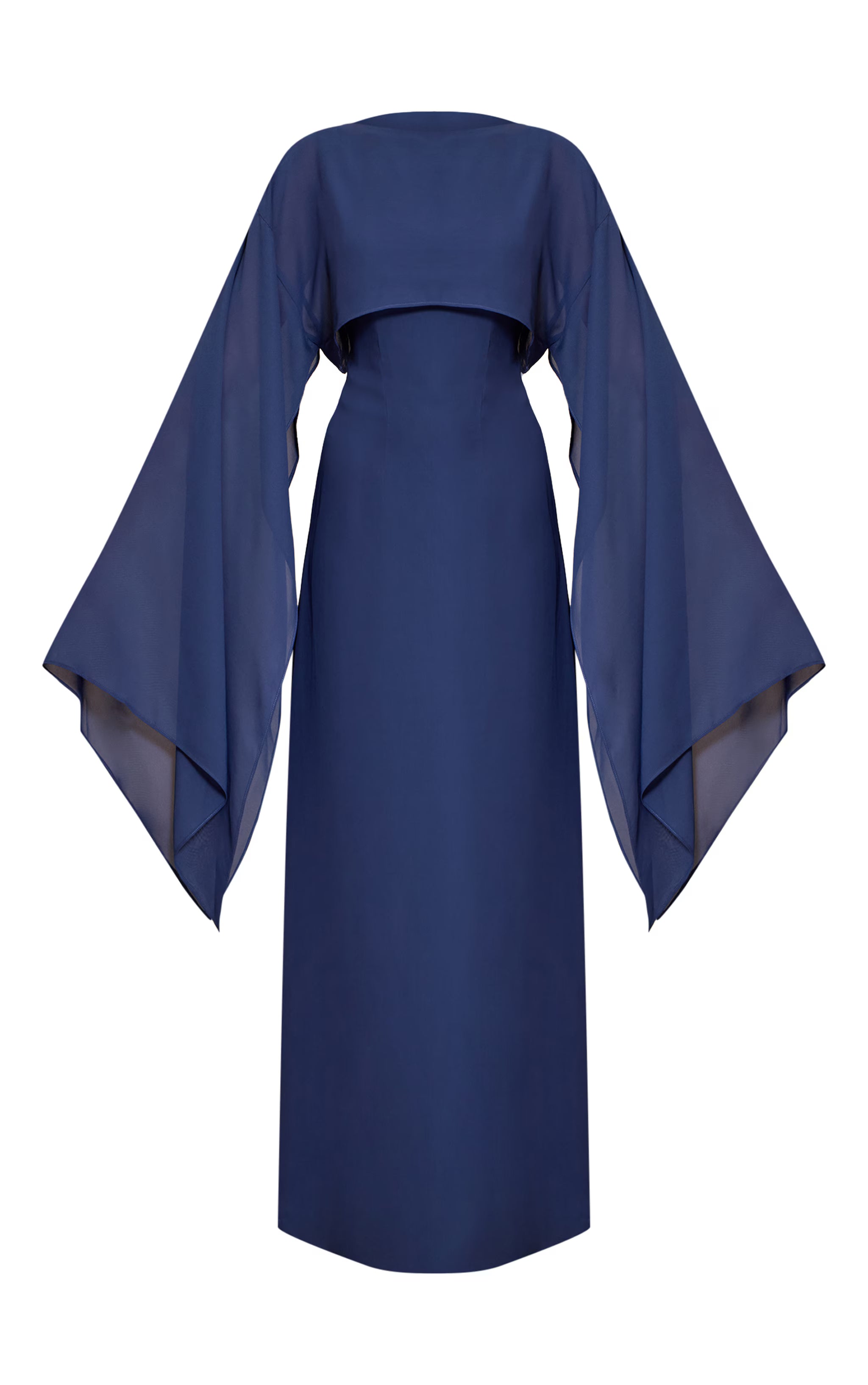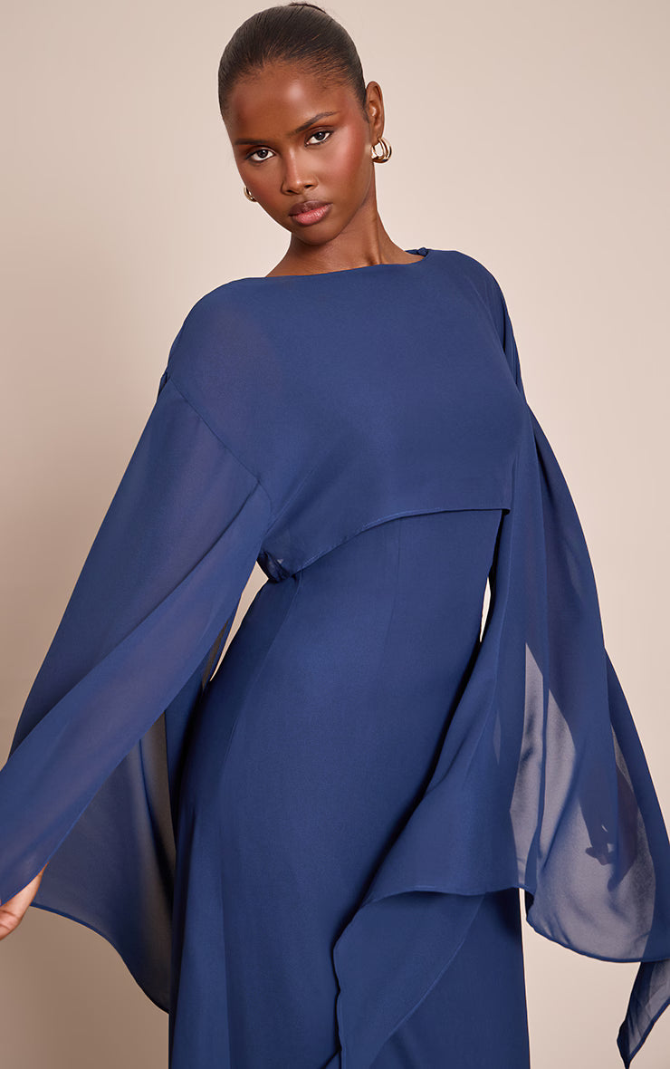 Make an unforgettable entrance in the navy cape detail maxi dress, designed for your most impactful moments. This elegant piece features a floor-sweeping silhouette with striking, flowing cape sleeves that create a dramatic, artful movement. Elevate this occasion-ready dress by styling it with statement heels and adding a chic white shoulder bag to carry your essentials.