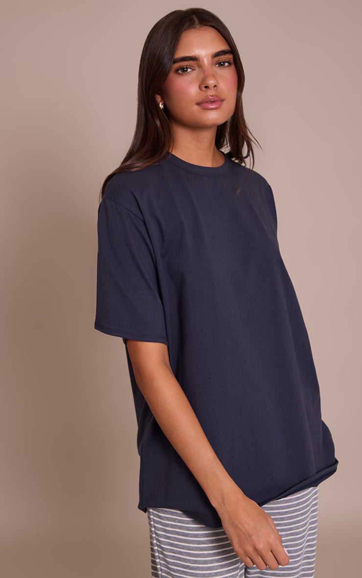 Turn heads this season with this navy cotton basic oversized t shirt. Brought to you in a navy cotton material with a basic oversized fit for a versatile look that is perfect for those off-duty days. Team this t shirt with a pair of wide leg jeans and gold hoop earrings for a fool proof finish.