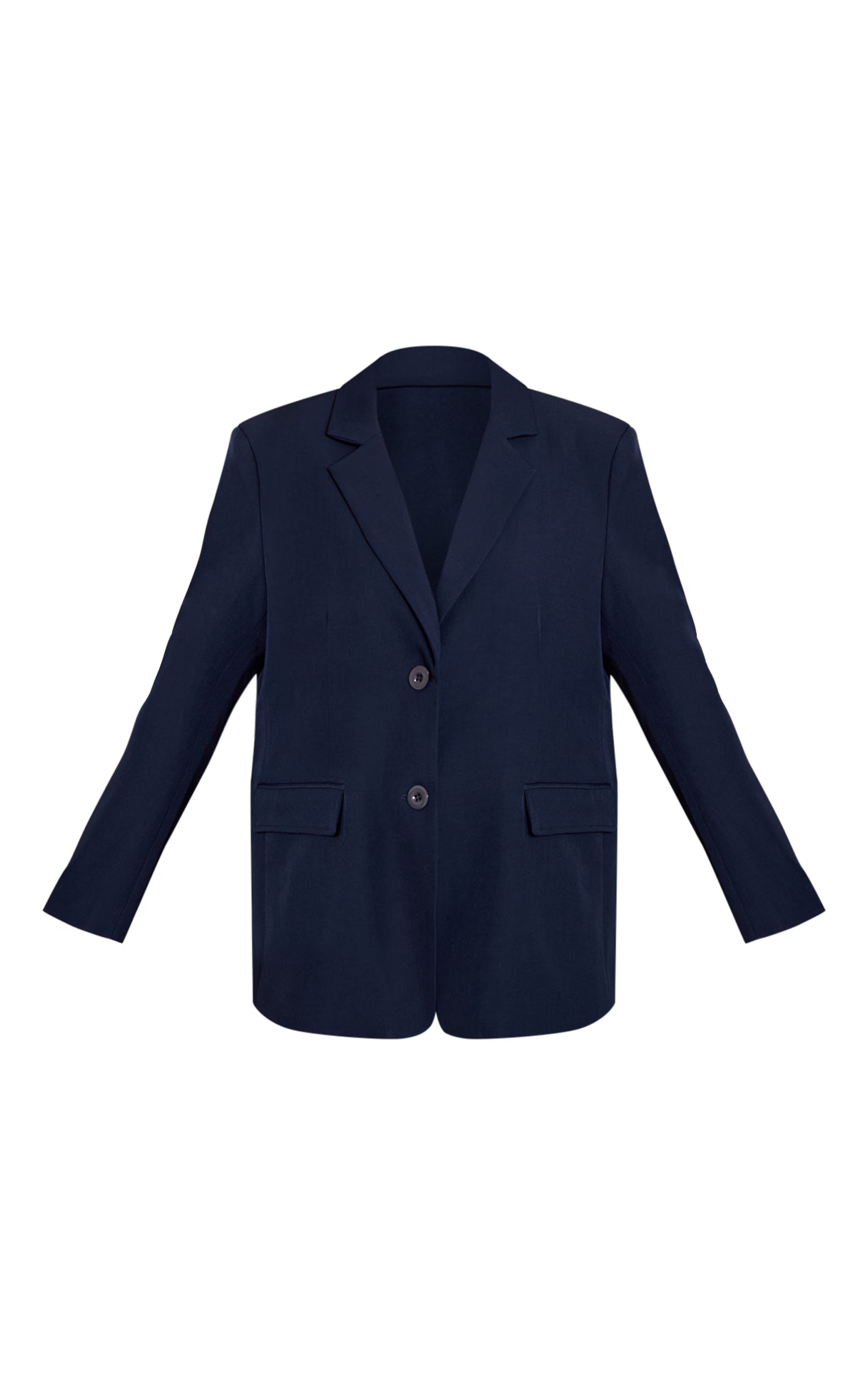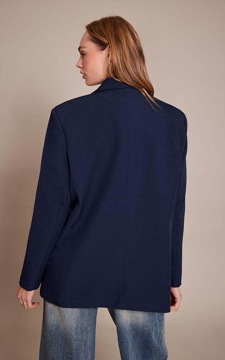 Every considered look starts here. The navy oversized blazer defines a confident aesthetic with its generous silhouette and sharp notched lapels, featuring a single-breasted two-button fastening with complementary brown buttons and functional flap pockets, perfect for modern versatility. Layer yours over a simple cami and wide-leg pants, grounding the ensemble with commanding boots, and finish with delicate gold earrings for an effortlessly put-together statement for day.