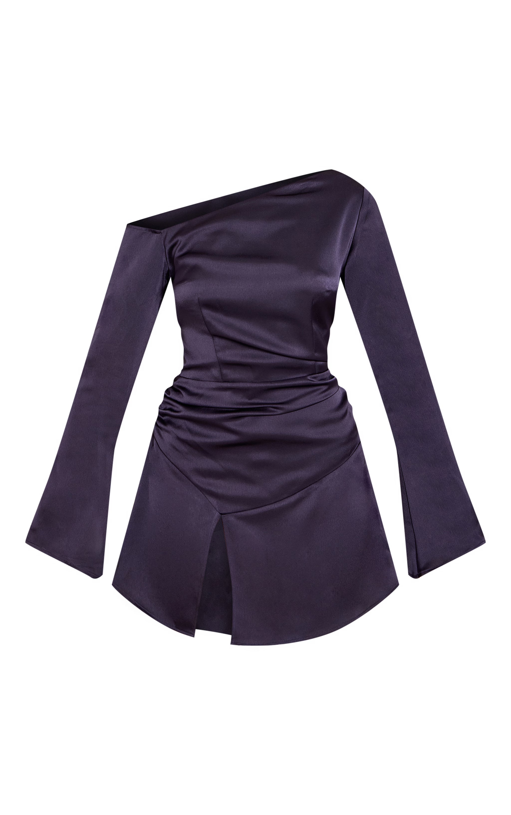 Make an artful entrance with the navy satin asymmetric long sleeve mini shift dress, a piece designed to command the evening. Featuring a daring one-shoulder silhouette and artful ruching that accentuates the form, this dress flows into a statement mini skirt with a seductive thigh split. Elevate this design with strappy heeled mules and a touch of pearl earrings for an ensemble that speaks of pure confidence.