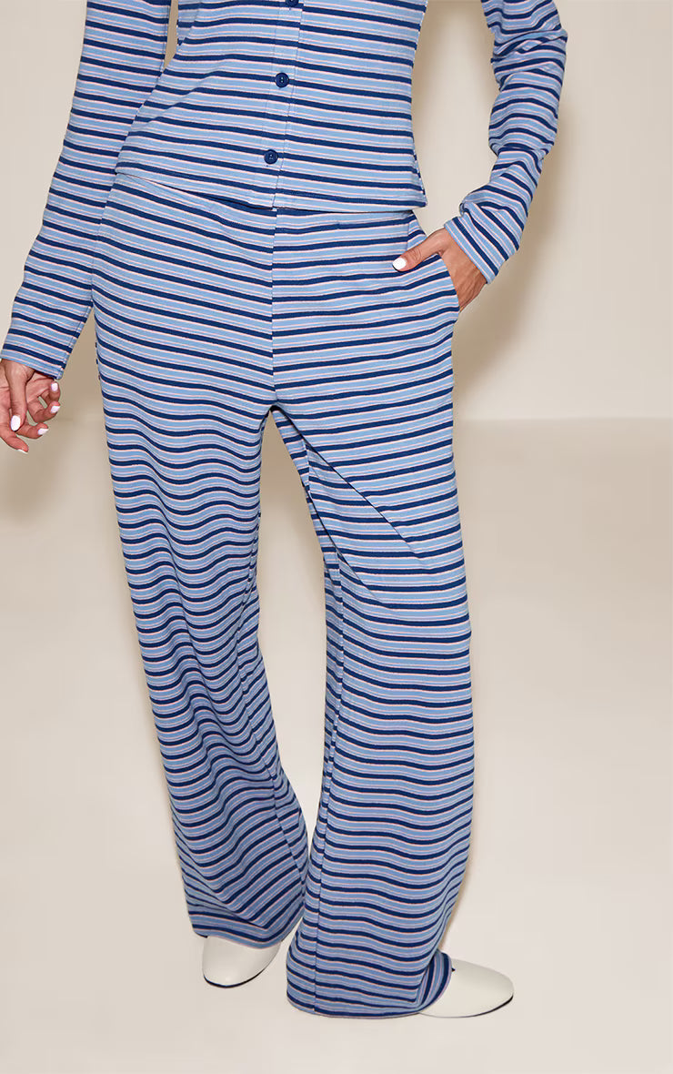 Own your day with an aesthetic that balances comfort with undeniable style. The navy soft fleece pinstripe straight leg pant redefines casual wear with its relaxed cut and full-length profile, creating a confident silhouette that moves with ease. Featuring a distinct striped pattern in varied blue hues, this piece forms the perfect base for a curated ensemble. Style it effortlessly with the coordinating button-front top for a cohesive two piece set look, anchoring your presence with sleek black ballet flats. Complete your considered aesthetic with subtle accessories, mastering an artful blend of knowing ease and undeniable appeal.
