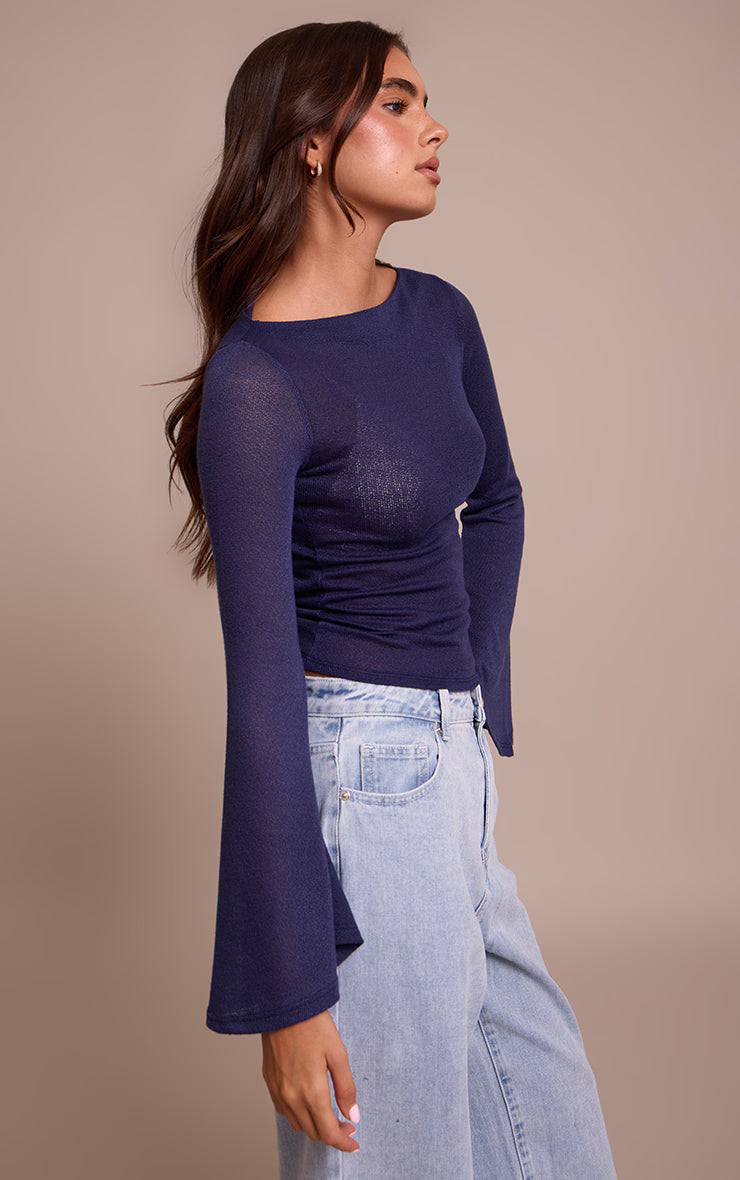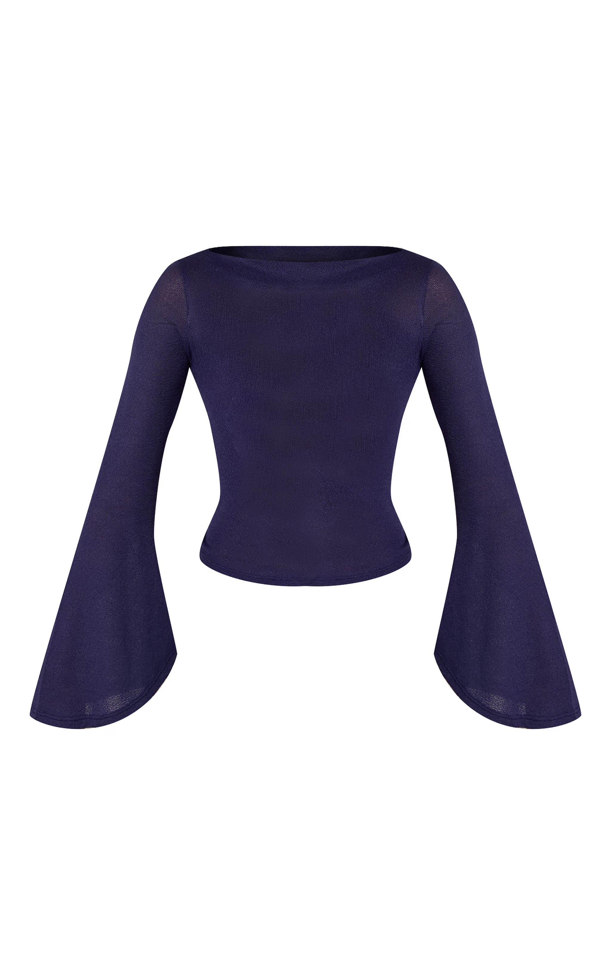 Bring drama to your look with the navy textured extreme flute sleeve long top. Crafted from textured woven fabric in a rich navy tone, this top features exaggerated flute sleeves and a slim silhouette. Style with tailored pants and gold accessories for an effortlessly elegant outfit.