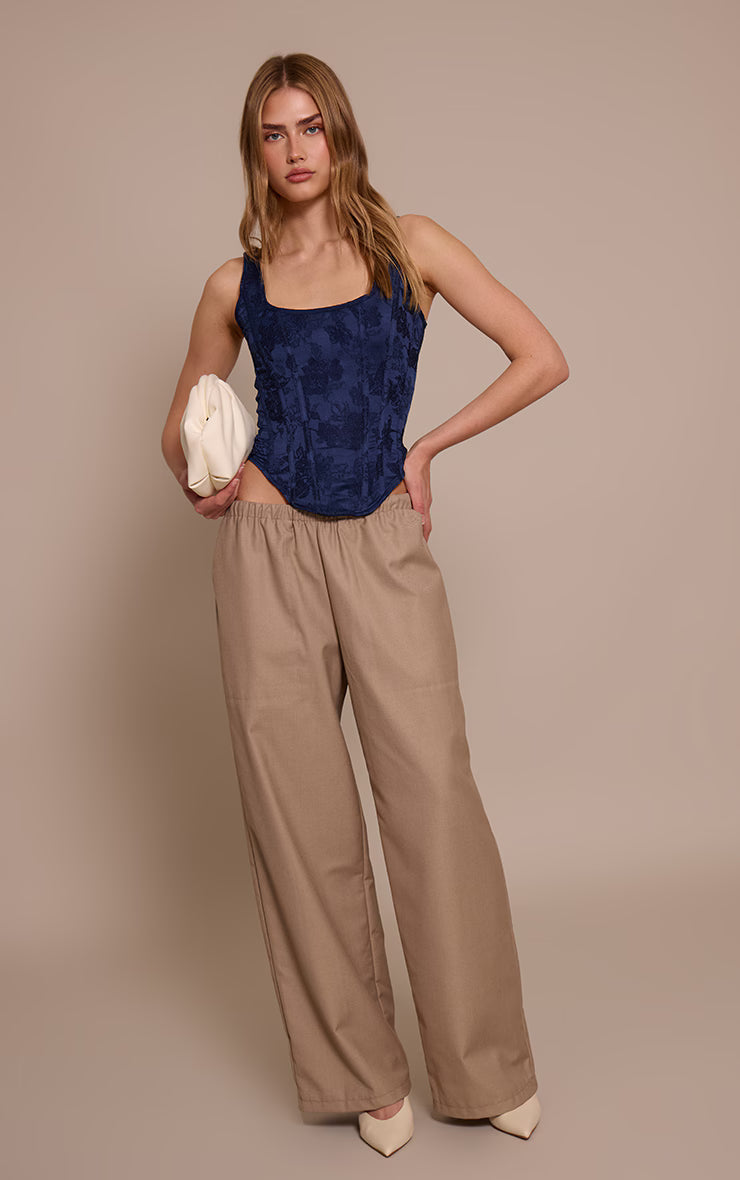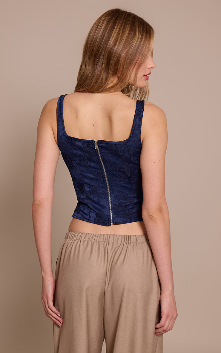 Redefine evening dressing with the navy textured satin boned dip hem longline corset. Crafted in luxurious navy satin with structured boning, this corset features a flattering dip hem that enhances the silhouette. Style with tailored pants and stilettos for an elegant finish.