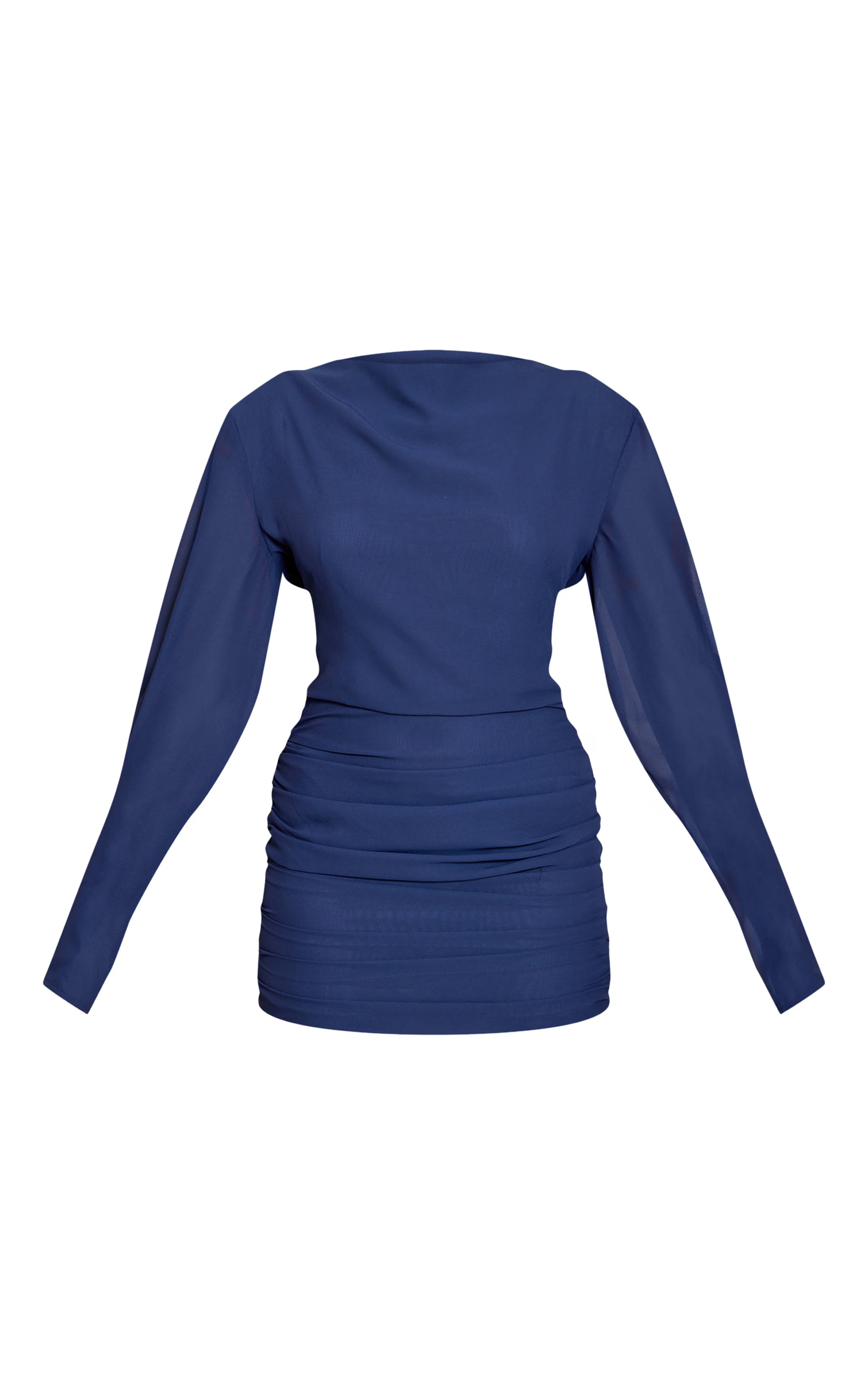 Define your evening agenda with the navy woven boat neck long sleeve ruched mini dress, a refined silhouette that speaks volumes. This piece features an elegant boat neck and artfully draped long sleeves, while clever ruching defines the form for a confident, mini-length finish. Amplify this sophisticated design with sleek kitten heels, adding a coordinating clutch bag to complete your elevated evening aesthetic.