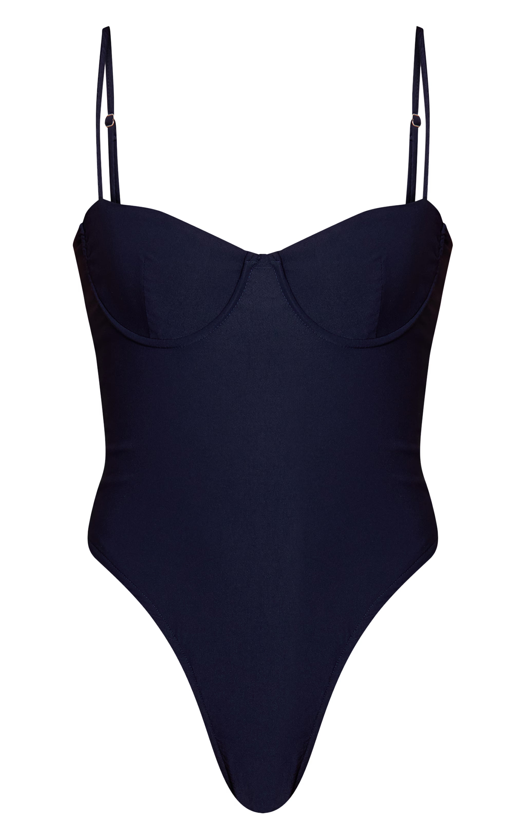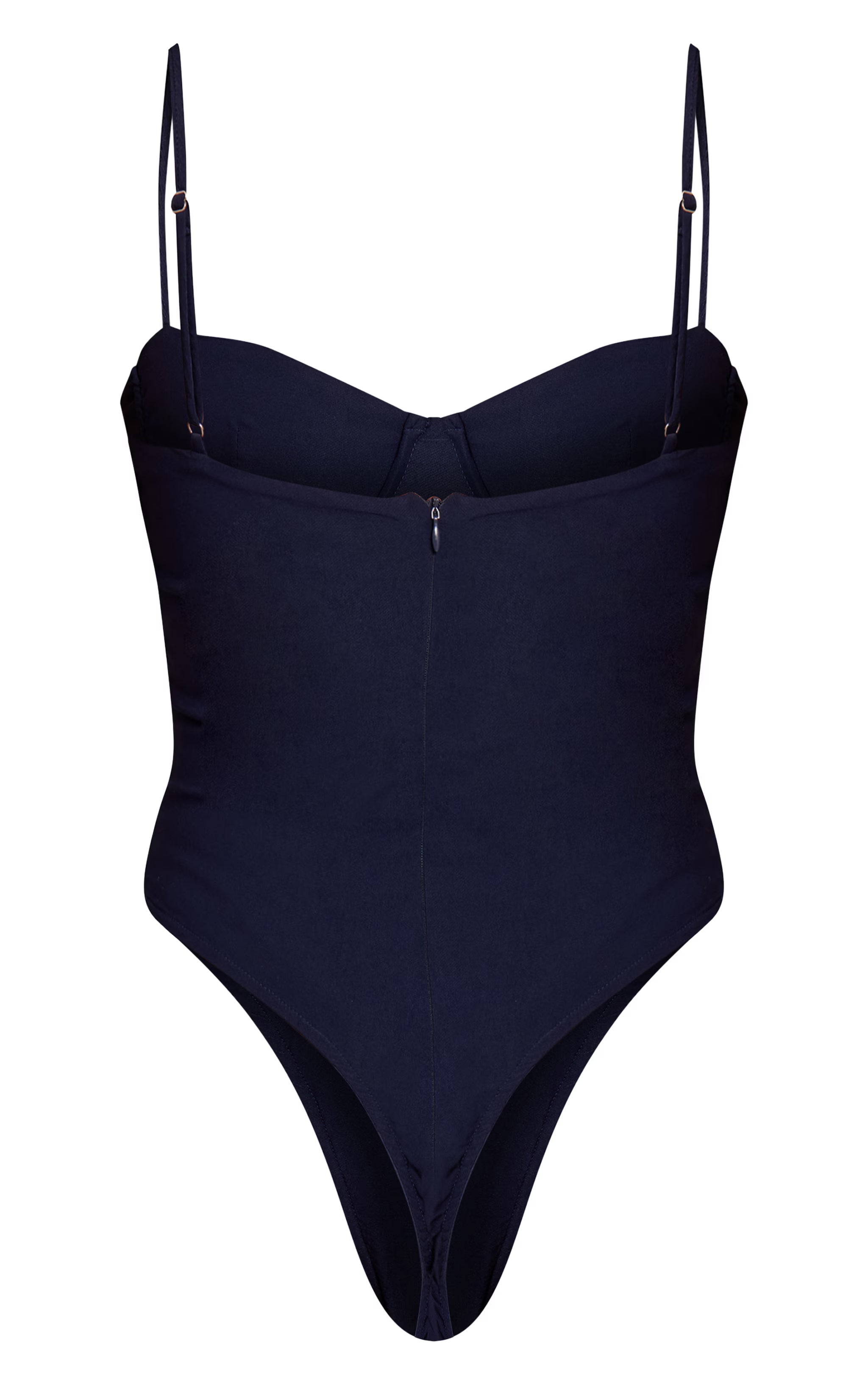 Shape your evening aesthetic with intent. The navy woven stretch strappy bodysuit offers a sleek, contoured silhouette, defined by its flattering sweetheart neckline and delicate, adjustable spaghetti straps. Its precise cut ensures a streamlined base, perfect for building sophisticated looks. Anchor this navy piece with sharply tailored wide-leg pants and elevate the ensemble with striking metallic heels; a structured black bag will complete the look. This combination promises an entrance with undeniable presence, effortlessly artful.
