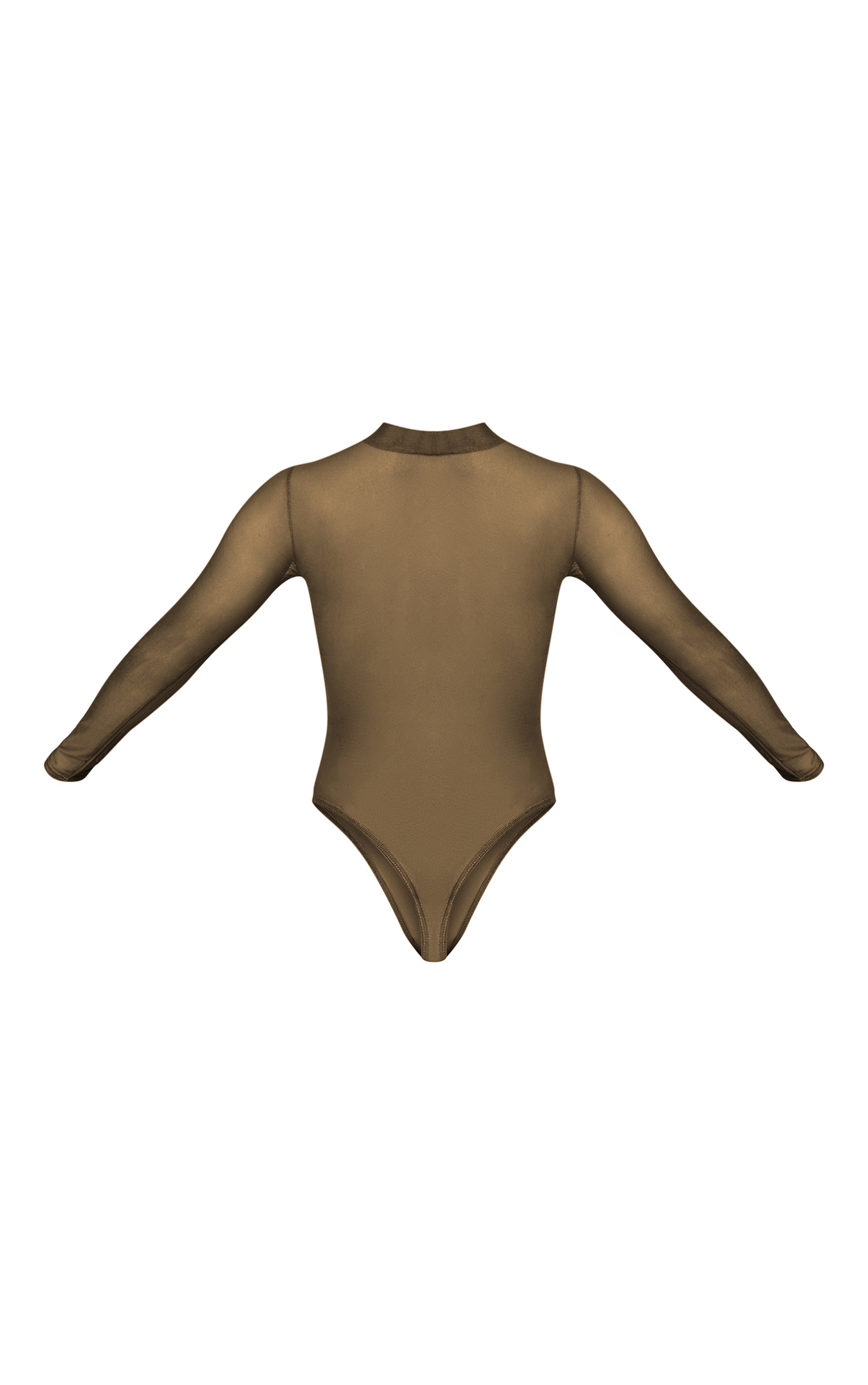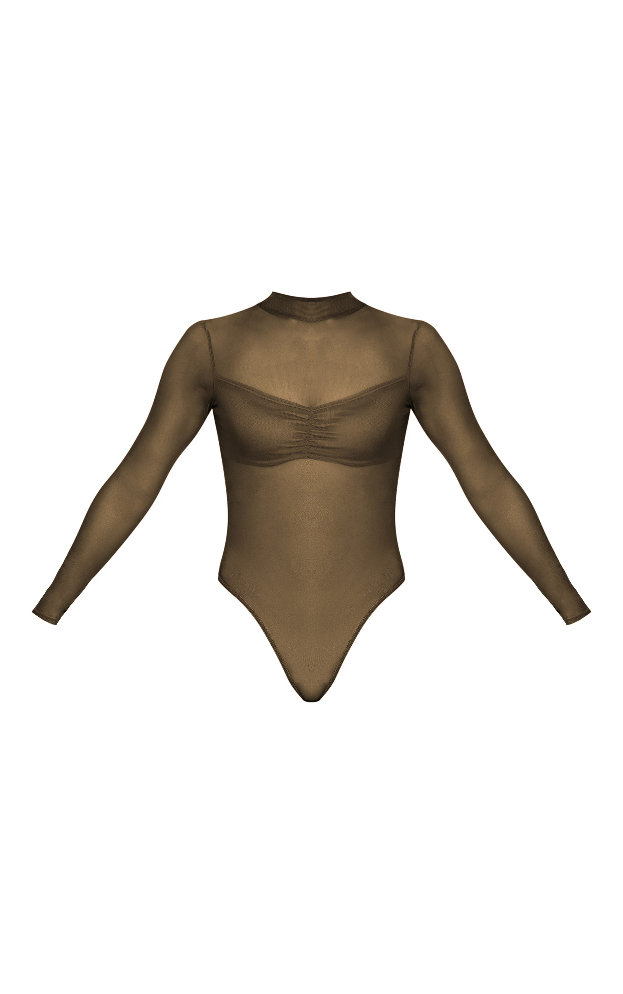 Define your evening presence with a piece designed for knowing allure. The olive bust panel mesh high neck long sleeve bodysuit sculpts a confident profile, featuring an elegant high neckline and neat long sleeves. An artfully ruched bust panel adds intentional dimension, all rendered in a sheer, sophisticated olive mesh. For an assertive evening ensemble, style this piece with sleek tailored pants, grounding the look with discerning pointed toe heels. Complete your polished presence with subtle gold earrings, ensuring an undeniable finish for every turn.