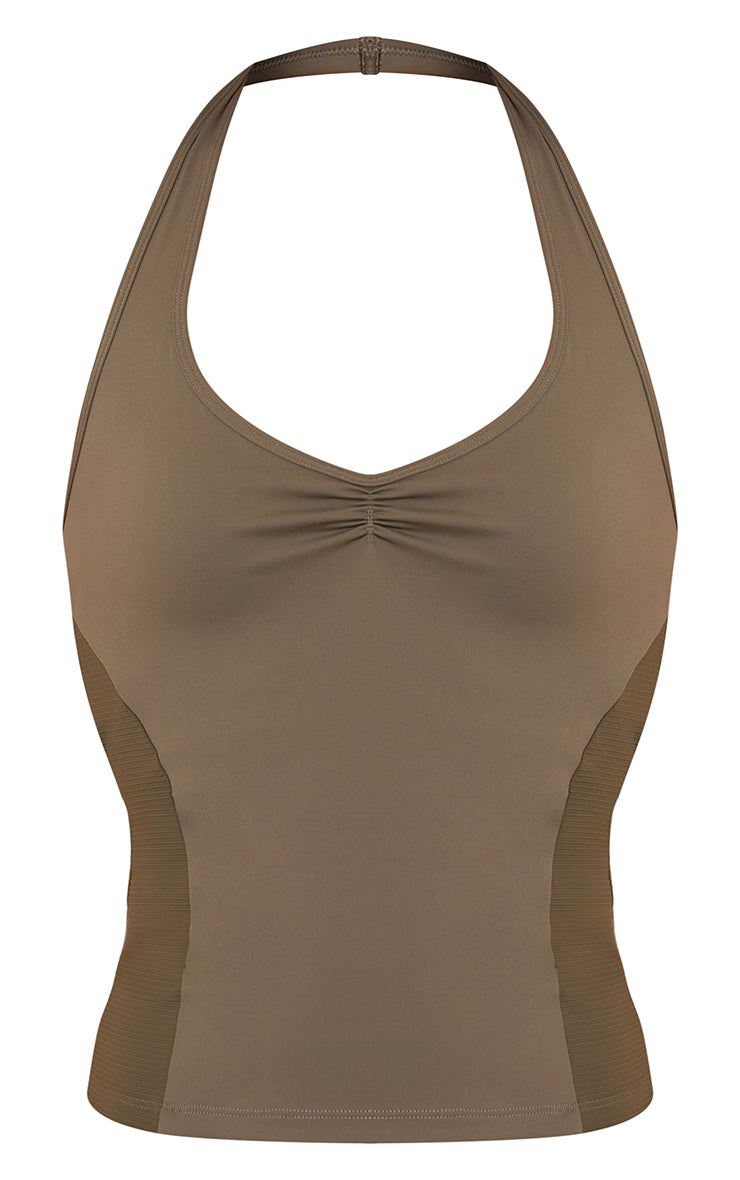 Channel sporty sophistication in the olive sculpt rib panel halterneck gym top. Designed in stretch ribbed fabric in a muted olive hue, this top features a halterneck design that enhances movement and comfort. Style with matching leggings and sneakers for a coordinated fitness look.