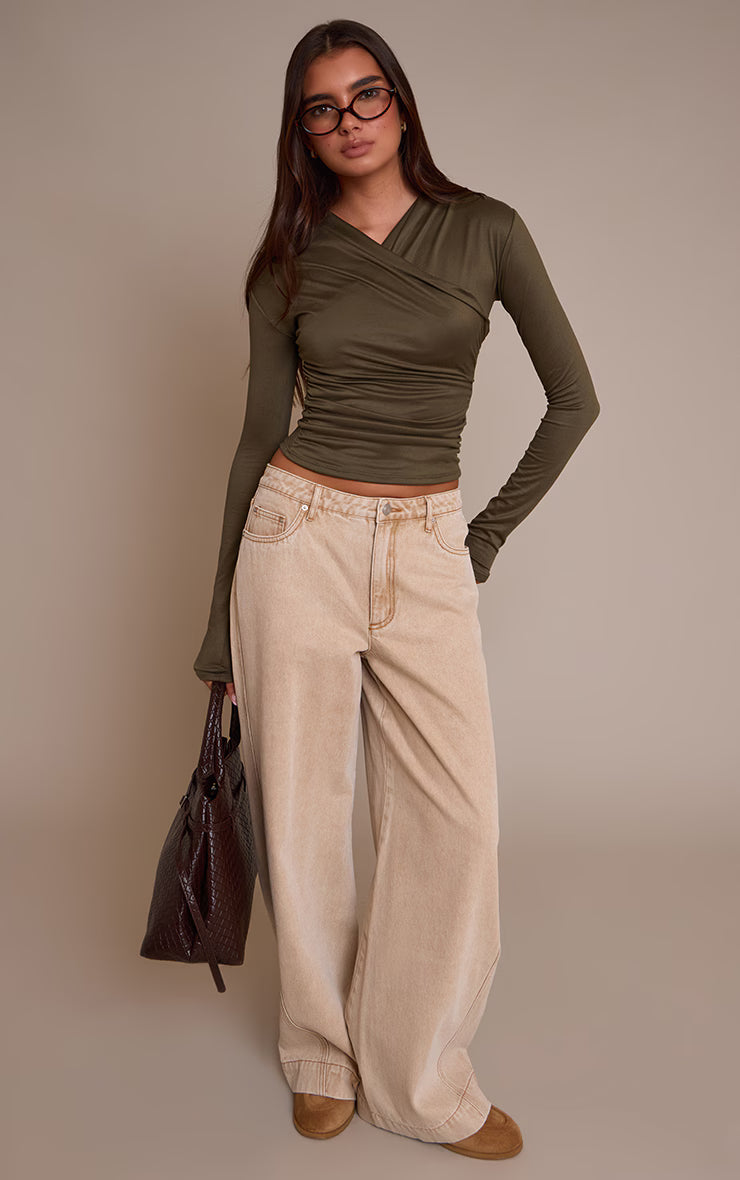 Master the art of understated allure. The olive soft touch ruched front detail long sleeve top is designed with an artful wrap-front V-neckline that subtly frames the decolletage. Strategic ruching through the side panel creates a flattering contour, flowing into sleek long sleeves. Its cropped length offers a contemporary silhouette, perfect for pairing with high-waisted tailored pants or relaxed denim. Ground your look with chic ankle boots and complete with delicate gold hoops for an effortlessly refined aesthetic that carries you through the day.