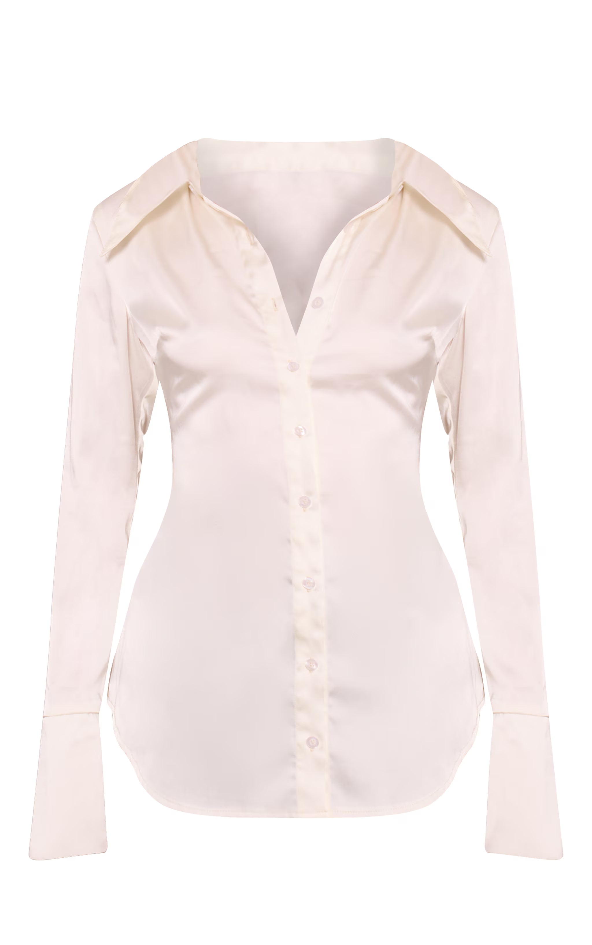 Make an impact for after-dark with a staple that offers refined tailoring; the oyster satin oversized collar button down fitted shirt is cut to a sharp silhouette, featuring a distinctive oversized collar that frames the neckline, leading to a classic button-down front. Its sleek, fitted shape creates a polished profile, complemented by elegant long sleeves with deep cuffs and a curved hemline, perfect for wearing tucked or untucked. Pair this oyster blouse with tailored wide-leg pants and sharp black kitten heels for a confident evening ensemble, then finish the look with minimalist gold hoops and a sleek clutch to own the night with an effortless, self-assured presence.