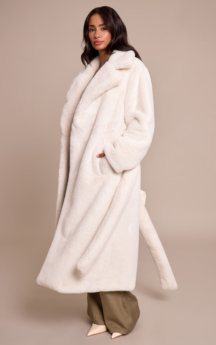 Cultivate your confident cold-weather aesthetic with an outerwear piece designed for undeniable presence. The petite beige faux fur tie waist maxi coat offers an expansive silhouette, its sweeping maxi length and generous revere collar creating a knowing drape. Complete with a self-tie waist, this coat allows for a customisable fit, adapting effortlessly to your mood. Layer it over crisp tailored pants and finish with chic kitten heels for a polished day ensemble. Add a pair of oversized sunglasses to complete an artfully confident look that transitions seamlessly.