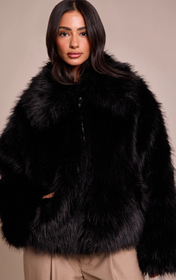 Make an entrance that truly arrives. The petite black oversized collar faux fur coat instantly commands attention, its voluminous silhouette and dramatic wide collar shaping an undeniable visual impact. This essential outerwear, rich in its deep black hue, defines a confident statement for your day edit. Drape it over a streamlined midi dress and opaque tights, completing your look with a pair of sharp black boots and a subtle shimmer from gold bracelets. This is how to channel an assured elegance for any moment.