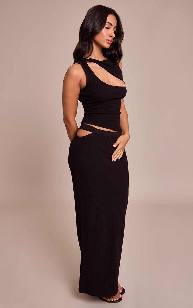 The petite black twist detail cut out top adds a touch of sophistication with its sleek and modern design. Featuring a twist front and subtle cut-out, it’s both flattering and bold. Style with high-waisted pants and black strappy heels for an elevated evening outfit.