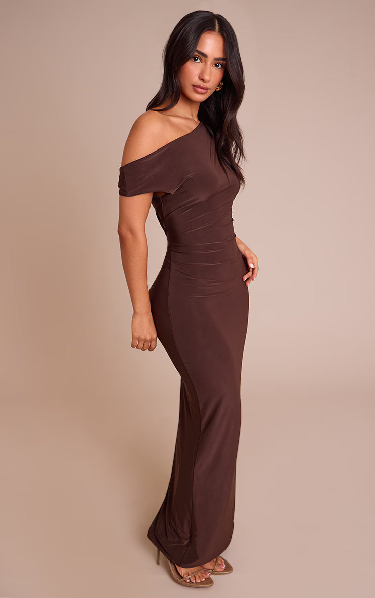 Embrace the art of deliberate dressing with a maxi designed to sculpt and define. The petite chocolate trim detail maxi dress, presented in a rich chocolate hue, establishes a sophisticated foundation. Its distinctive asymmetric neckline elegantly bares one shoulder, creating an artful detail without overstatement. The streamlined maxi length flows into a sleek silhouette, making a confident statement for any evening affair. Anchor this refined design with some sharp black mules, ensuring a cohesive and elevated look. Finish your aesthetic with subtle gold stud earrings, adding a polished gleam that complements the dress's inherent confidence. It's a piece that speaks to an undeniable sense of self.