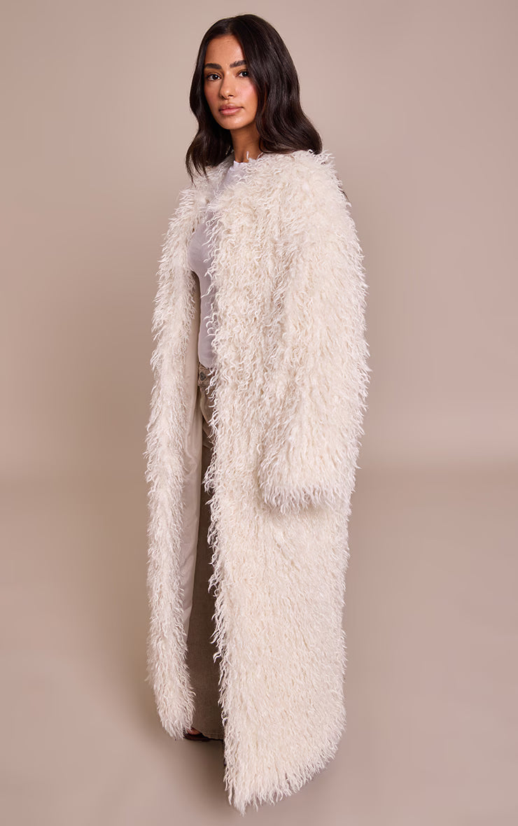 Embrace the art of oversized impact. The petite cream faux mongolian fur collarless maxi coat delivers an unmistakable statement, its sweeping full-length cut and generous, visually shaggy profile ensuring instant visual drama. A crisp collarless neckline offers a refined frame, allowing the cream tone and unique character of the 'faux mongolian fur' to speak for itself. Layer this confident piece over a streamlined top and wide-leg pants for an elevated day ensemble. Ground the look with chic ballet flats and delicate gold earrings, crafting an effortlessly knowing aesthetic for your day ahead.