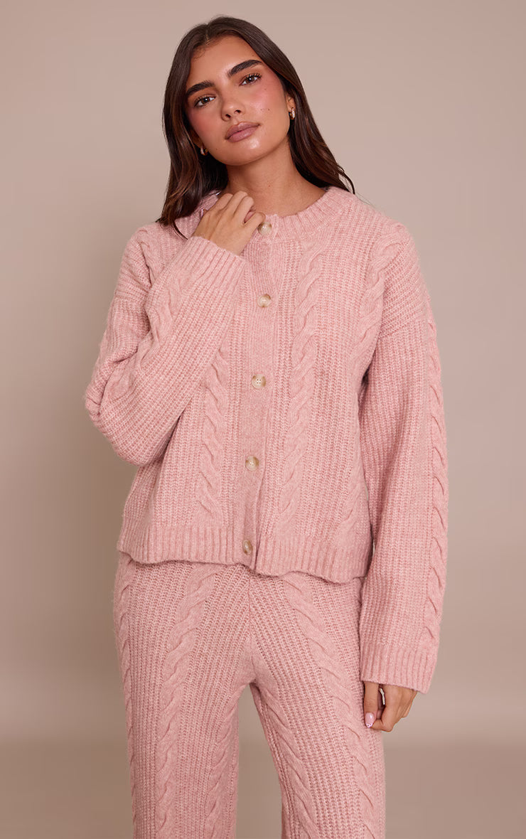 Introduce a soft yet striking touch to your rotation with a knit that perfects day dressing. The pink cable knit button through cardigan boasts a timeless round neckline and distinctive cable knit detailing that adds dimension to its soft pink hue. Its relaxed cut and functional button-through fastening offer versatile styling options, making it an effortless essential for any day agenda. Team this piece with classic denim or tailored pants for a polished day look, completing the ensemble with chic ballet flats and delicate stud earrings for a cohesive and considered aesthetic that speaks to refined style.