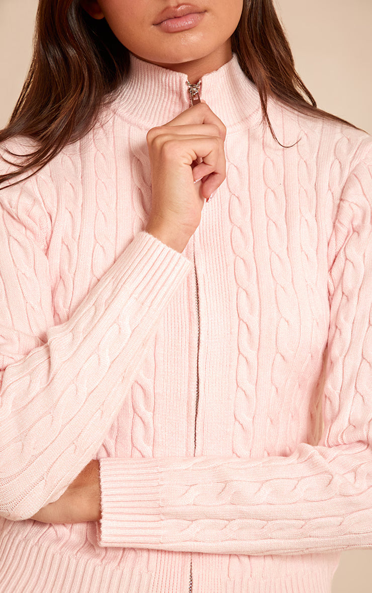 Inject essential polish into your daily rotation. The pink cable knit long sleeve zip up sweater offers a sleek, versatile silhouette with its distinctive cable knit pattern, adding depth to a confident, streamlined cut. A high, ribbed neckline and full-length zip fastening provide a modern edge. Team it with sharp tailored pants for a polished day ensemble, completing the look with sleek boots and a coordinating white shoulder bag. This design ensures your daily look projects an air of effortless confidence.