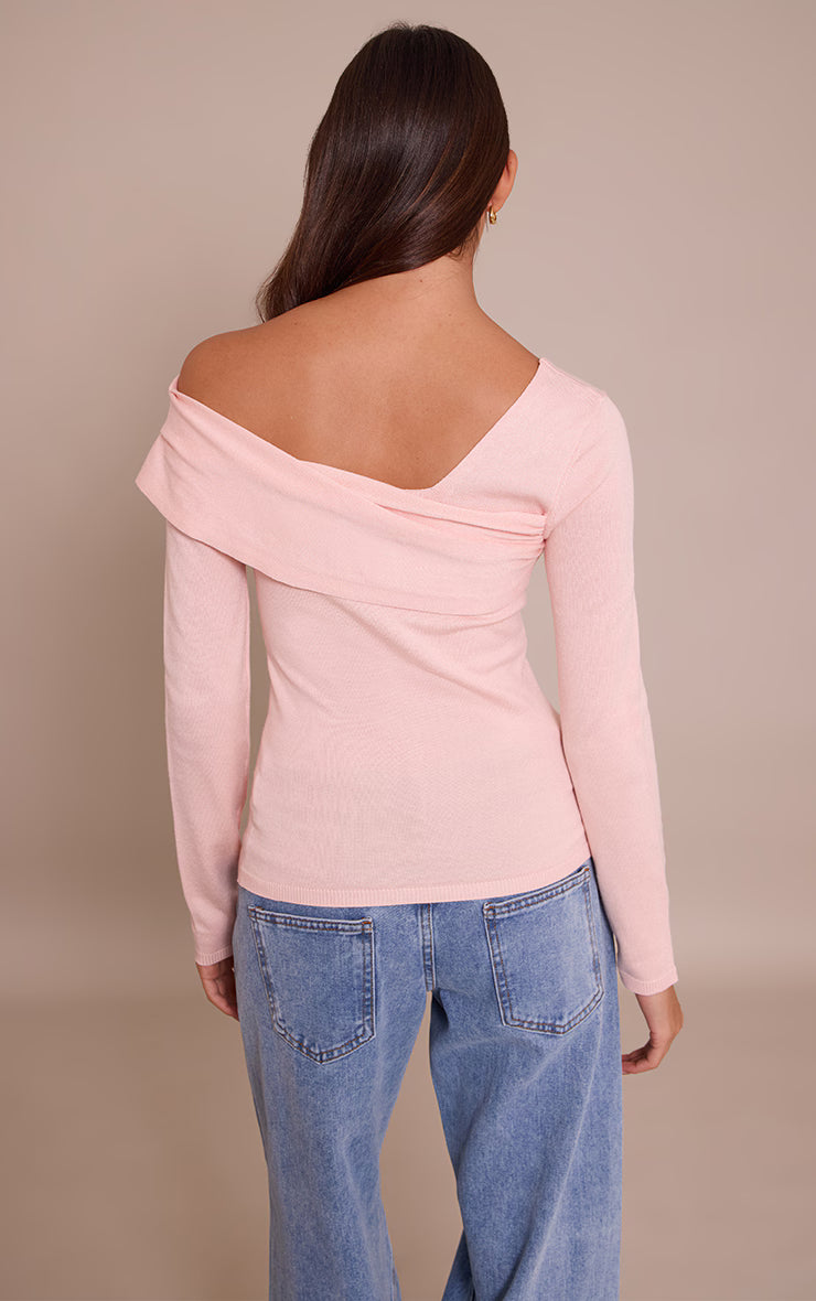 Own the moment with a design that speaks to considered style; this pink long sleeve asymmetric shoulder knitted top redefines contemporary knitwear. Its ingenious asymmetric neckline creates a distinct shoulder-baring silhouette, balanced by elegantly simple long sleeves. For evening, juxtapose its modern cut with sleek tailored pants, completing the refined aesthetic with sharp white kitten heels and a subtle gold ring for sophisticated impact. This curated combination delivers an effortlessly impactful presence, perfect for confident after-dark agendas.