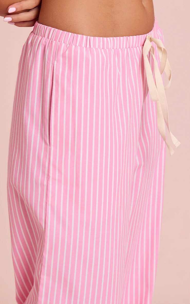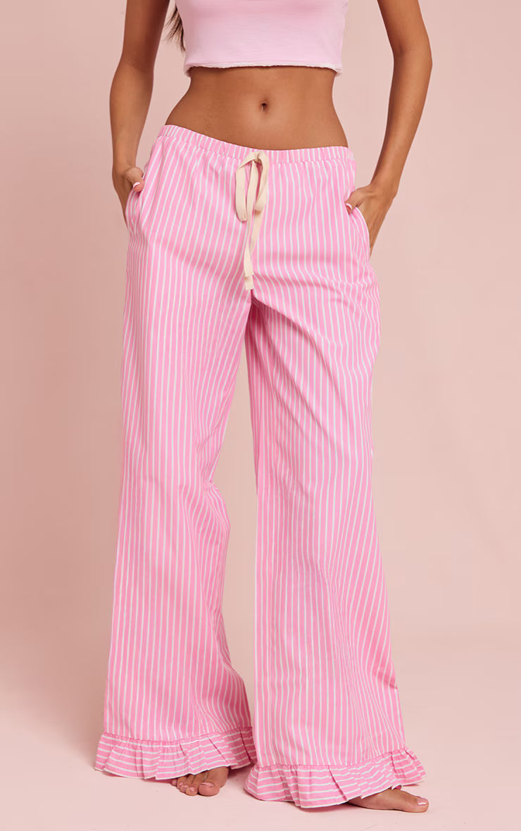 Master relaxed confidence with an artfully effortless silhouette. The pink pinstripe pants with contrast ties redefine sleepwear cool, presented in a soft pink hue with crisp white pinstripes. Their comfortable wide-leg cut flows with ease, while an elasticated waist, cinched by distinctive contrast ties, ensures a relaxed yet polished fit. A subtle ruffle detail at the hem adds a knowing touch to this versatile piece. For the ultimate bedtime aesthetic, add a basic cropped tee and cosy slippers.