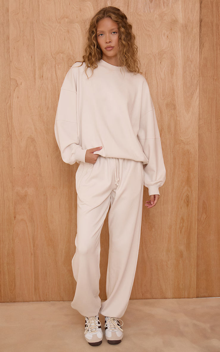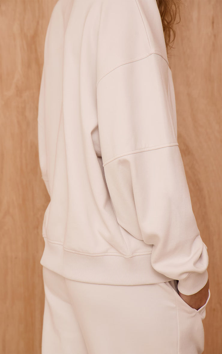 A knowing blend of relaxed ease and considered design, the plt cream interlock funnel neck Sweatshirt is an essential for your daywear rotation. Its confident, slouchy cut is framed by a distinctive funnel neckline, with neat ribbed cuffs and hem providing definition. Curate a cohesive aesthetic by pairing this with its matching cream bottoms, or introduce an assured contrast with tailored wide-leg pants. Finish the look with sharp ballet flats and minimalist accessories, such as a sleek black bag, for a truly polished appeal.