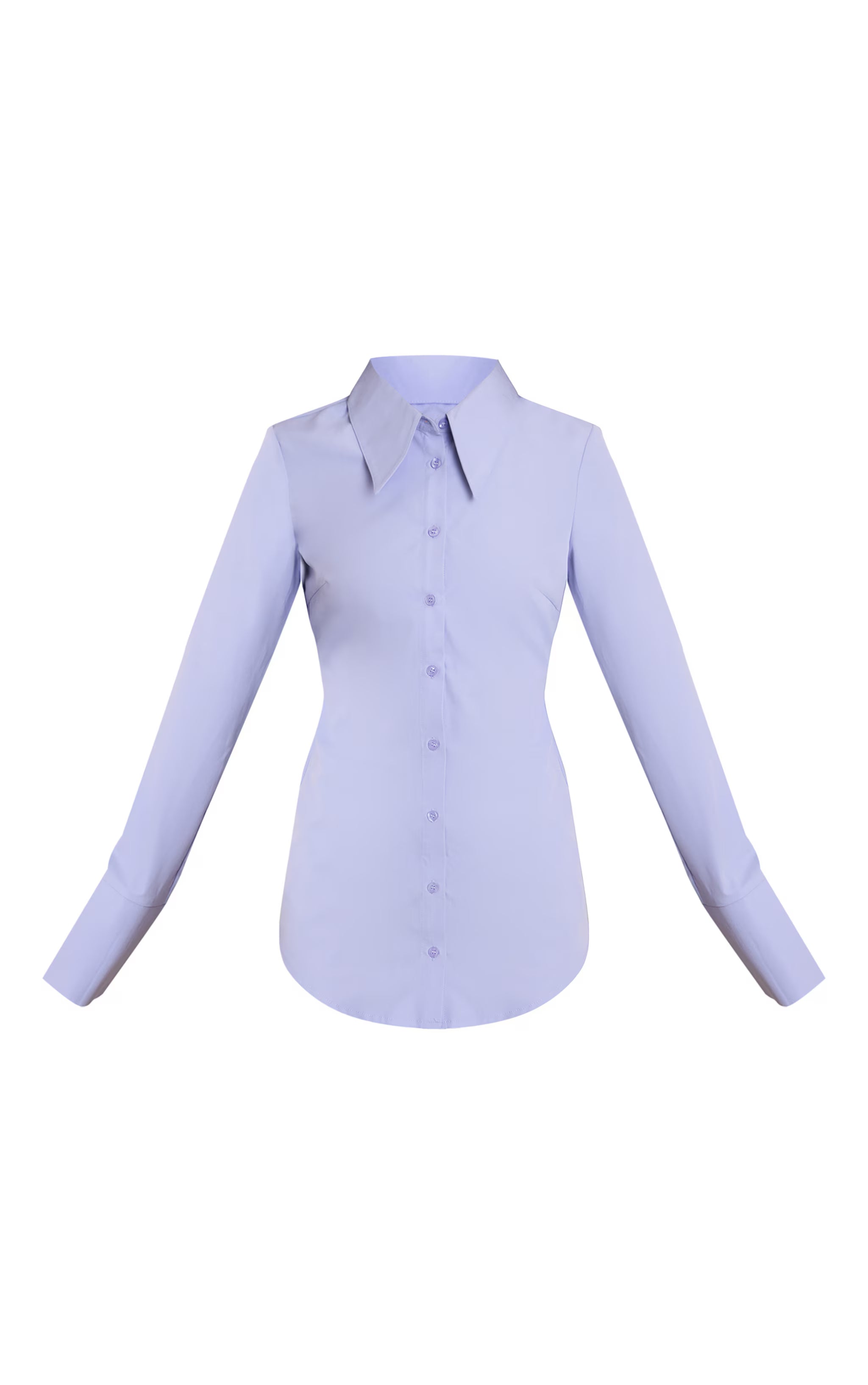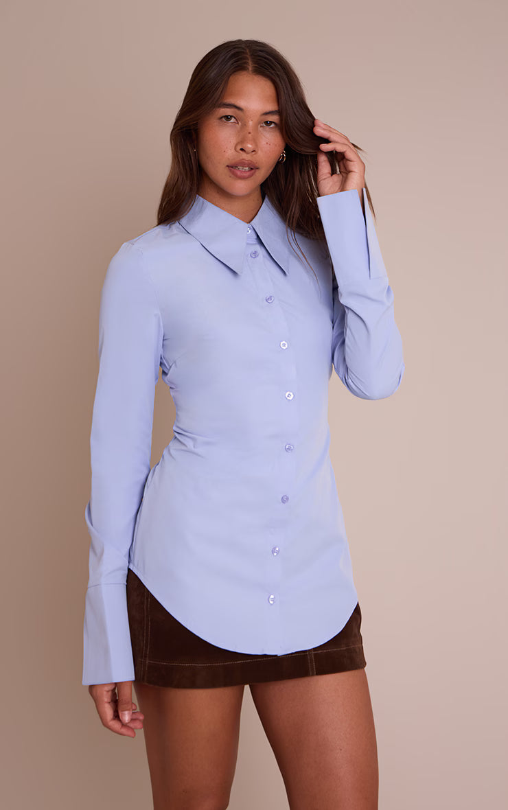 Refine your wardrobe staples with the PLT Label blue oversized collar button down fitted shirt. Designed in a crisp blue woven fabric, this shirt combines a structured fit with an exaggerated collar and clean button detailing. Team with wide-leg pants and heels for an elevated smart-casual aesthetic.