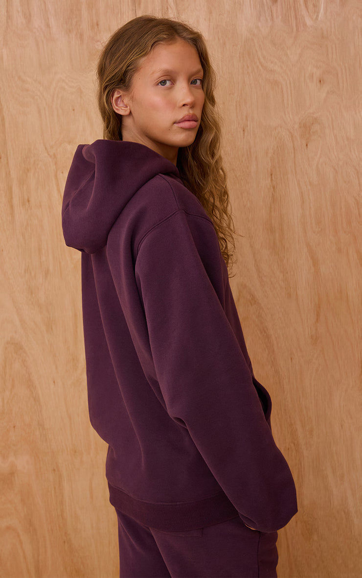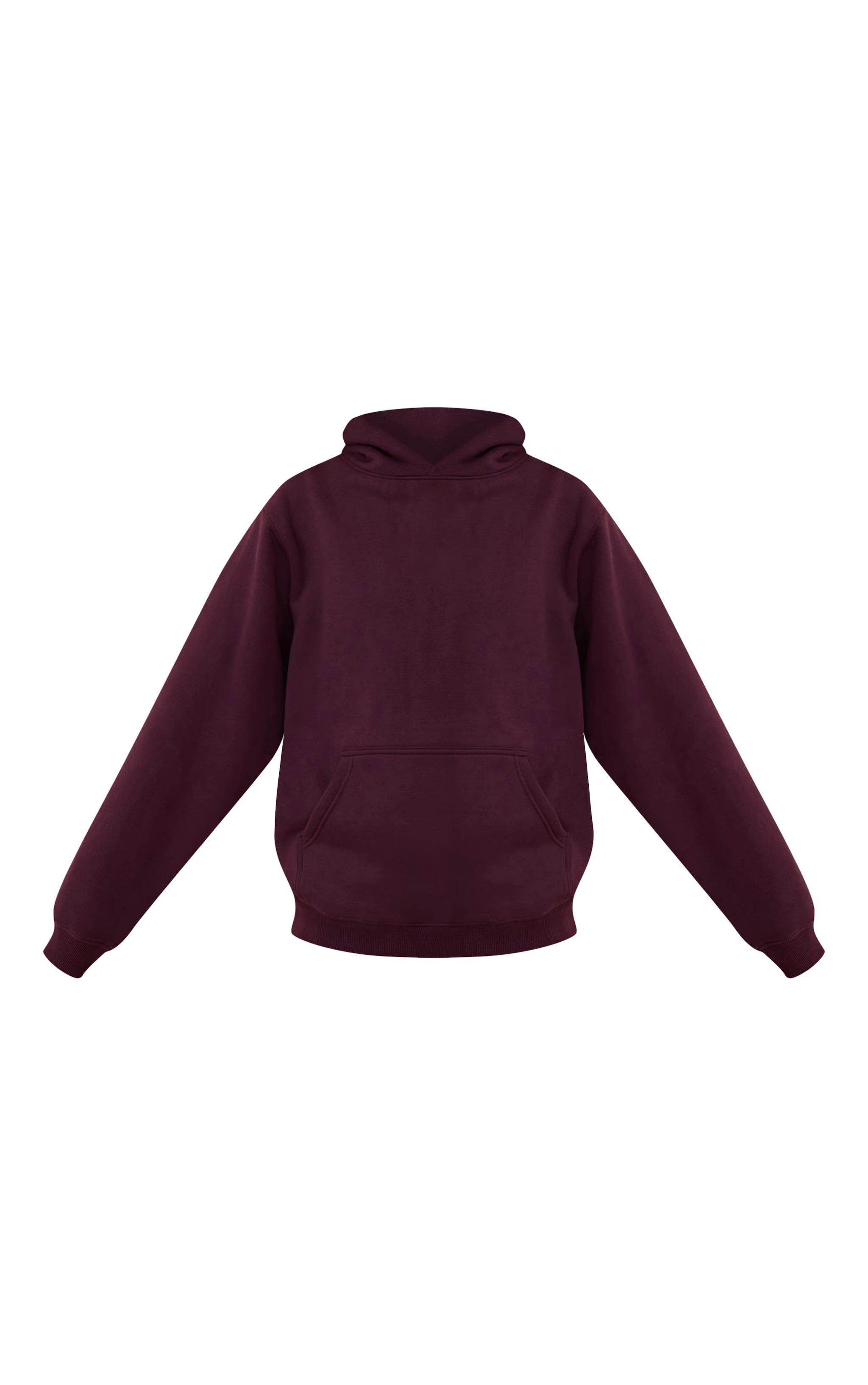 The blueprint for effortless style arrives with the plum cotton fleece oversized pull over hoodie. This confident purple piece boasts a relaxed oversized cut, complete with a classic hood and practical kangaroo pocket, all finished with dropped shoulders for an easy silhouette. Team it with coordinating sweatpants for a seamless day look, then elevate the ensemble with sleek knee high boots for an unexpected edge. Complete the aesthetic with subtle gold earrings for a polished finish that asserts your understanding of elevated casual.