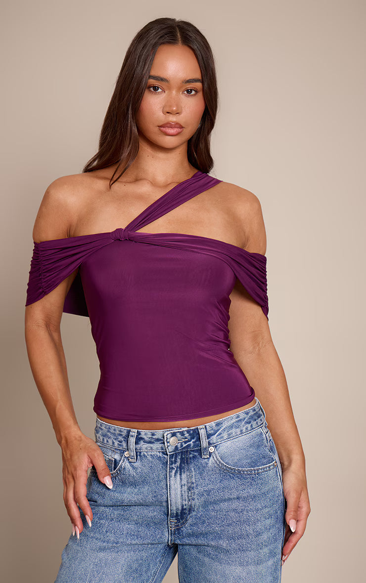 Unfold a new dynamic for evening dressing with the plum double layer slinky abstract sleeve detail top. This distinctive plum piece features an artfully draped off-shoulder neckline that elegantly bares the decolletage, complemented by a unique twisted front detail and abstract sleeve elements that create a striking silhouette. Pair this confident top with sleek tailored pants or a sharp midi skirt for a commanding ensemble. Complete your knowing look with a pair of black mules and a minimalist gold ring, ensuring your presence is both refined and utterly self-aware.