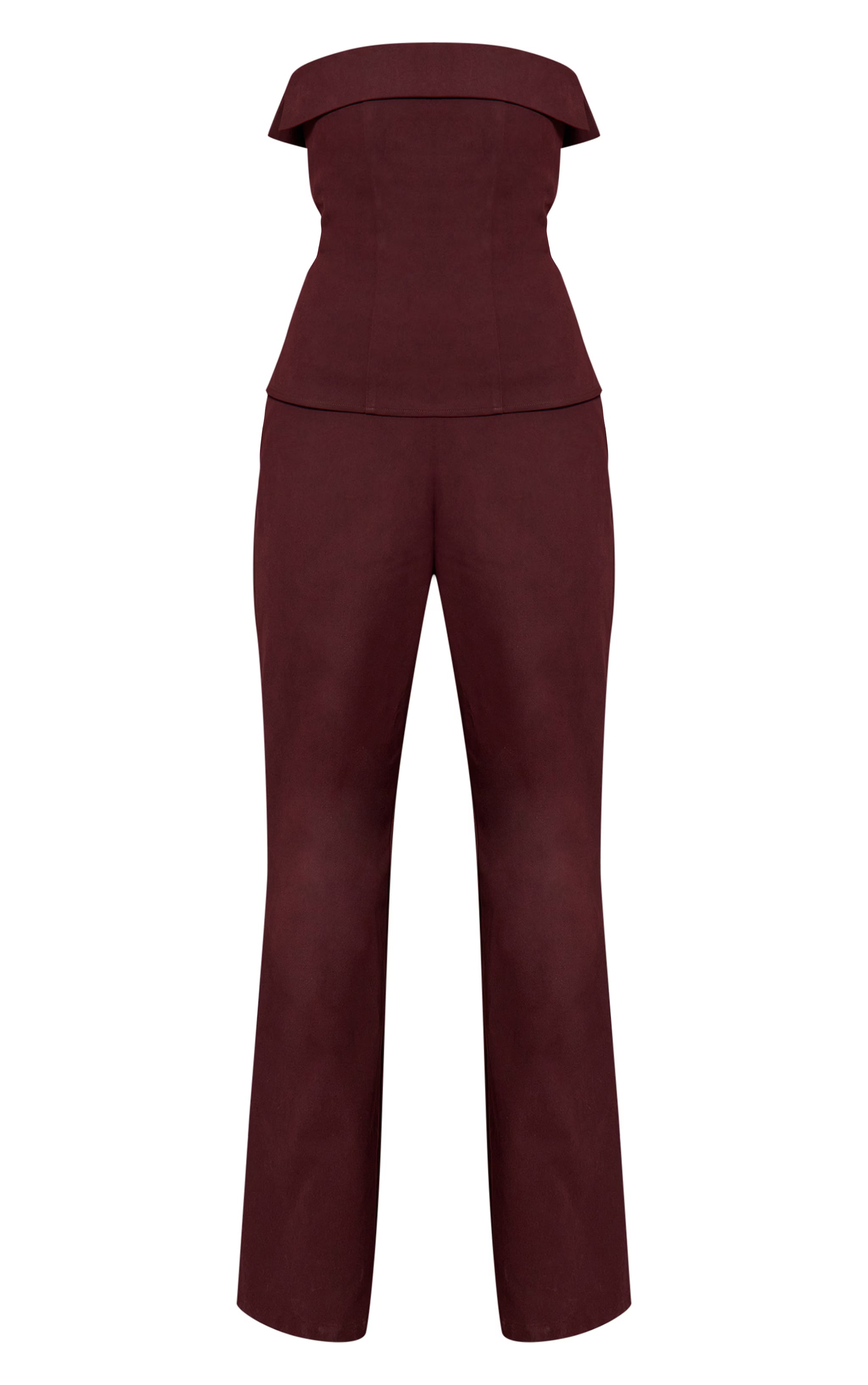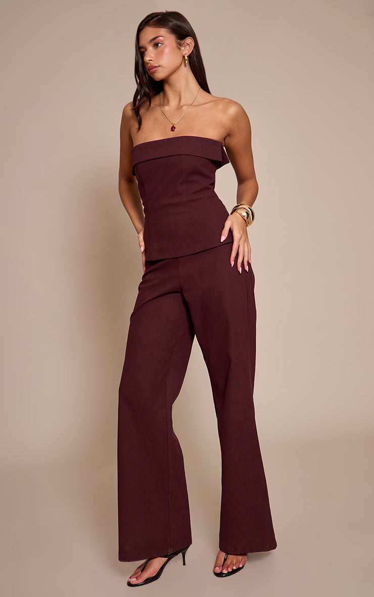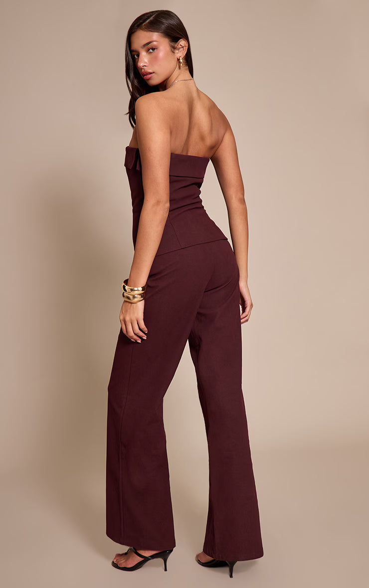 Dial up the drama for your next night out in the plum faux suede bandeau foldover jumpsuit. Its striking bandeau neckline, complete with a contemporary foldover detail, highlights the decolletage, leading into a refined bodice. The wide-leg pants cascade to the floor, offering an elongated, confident line. Pair with strappy high heels to maximise the leg-lengthening effect, then finish the look with bold gold earrings and a simple clutch. This effortlessly chic piece is your answer to sophisticated evening dressing.