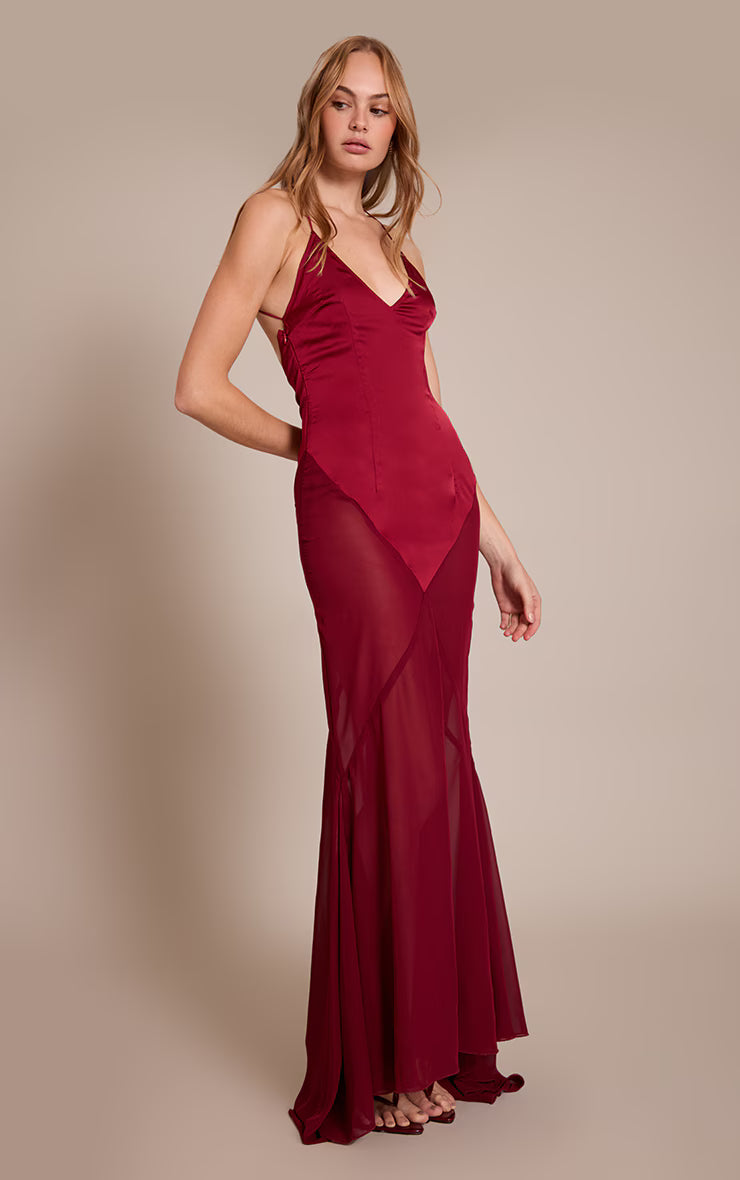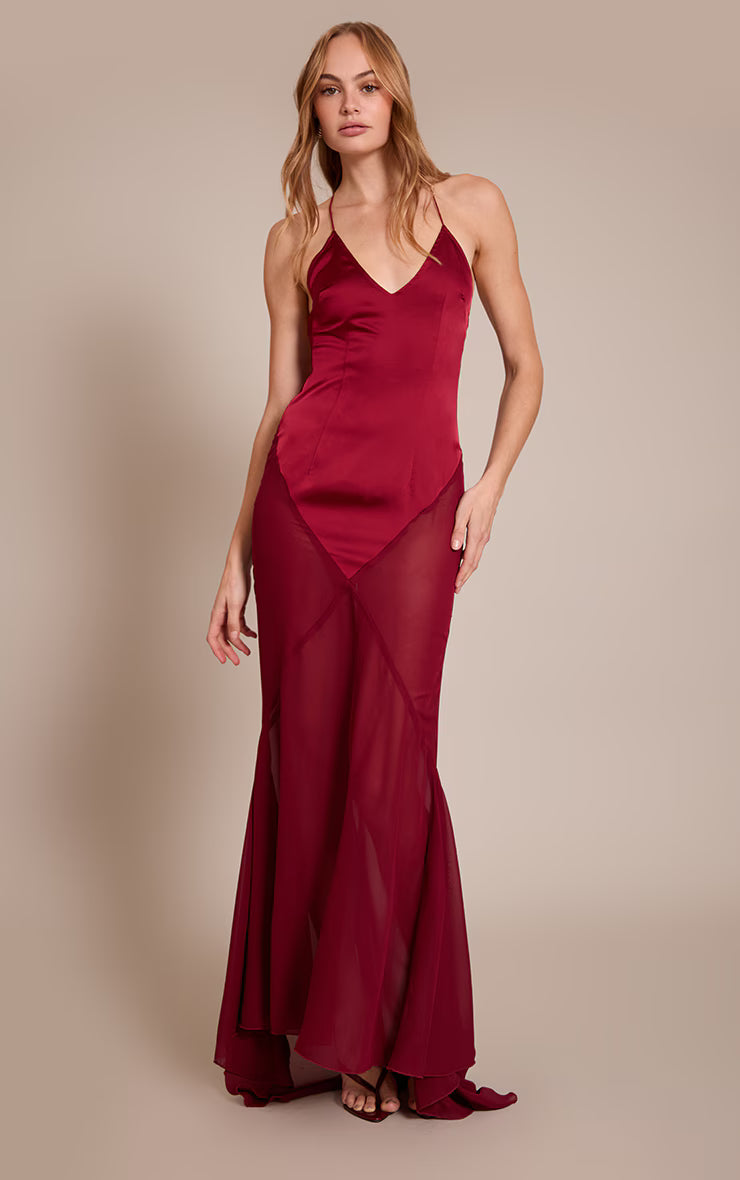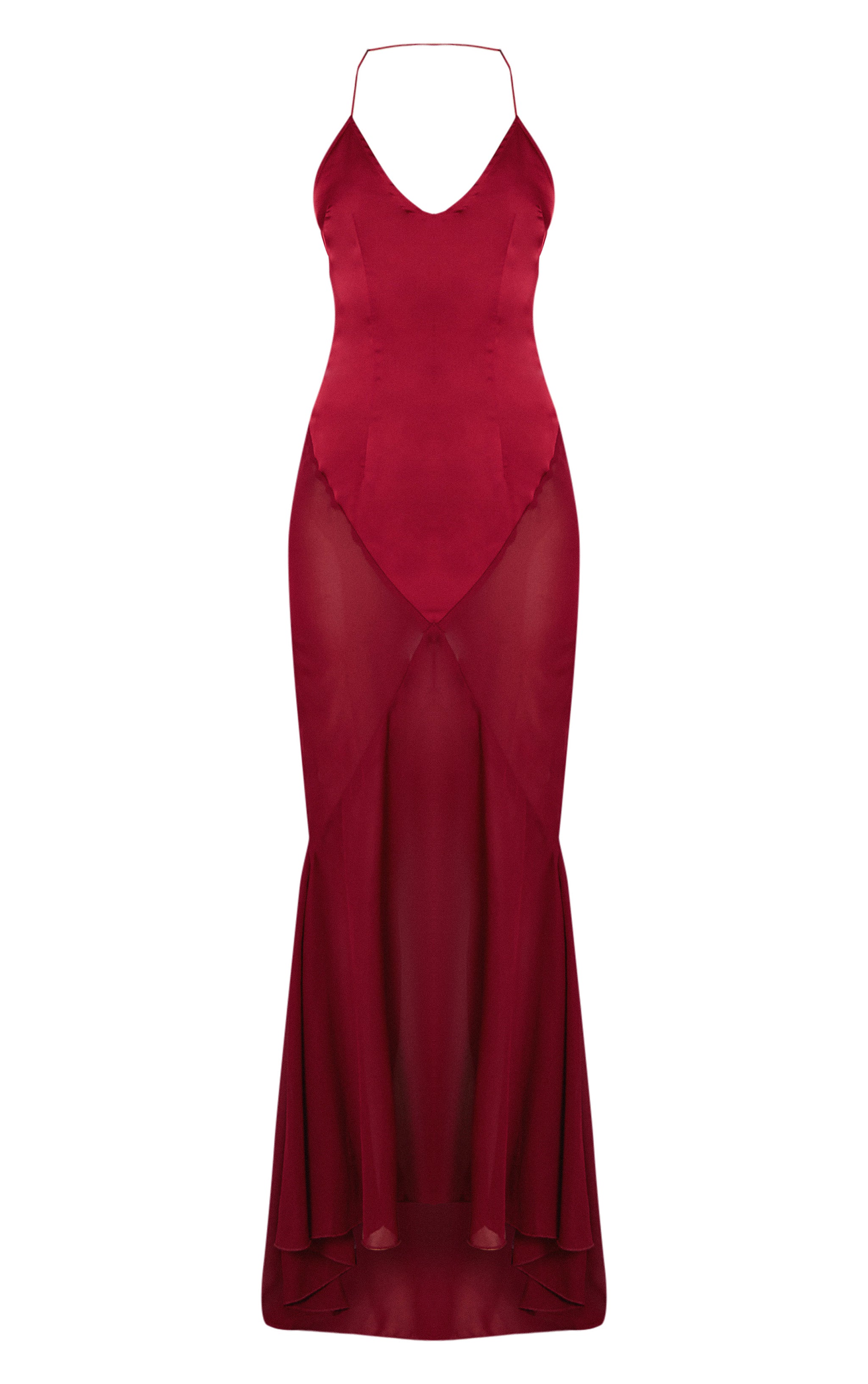 Make a knowing entrance in the plum satin contrast v neck maxi dress, a piece that blends effortless confidence with artful design. Its deep V-neckline and slender halter straps frame the décolletage, leading to a sculpted satin bodice that contours the frame. The maxi skirt unfolds with striking geometric sheer panels, meticulously stitched to create a modern, elongated silhouette that ensures every stride is captivating. Complete this elevated evening ensemble with sharp platform heels and a sleek black bag, owning the moment with unapologetic style.