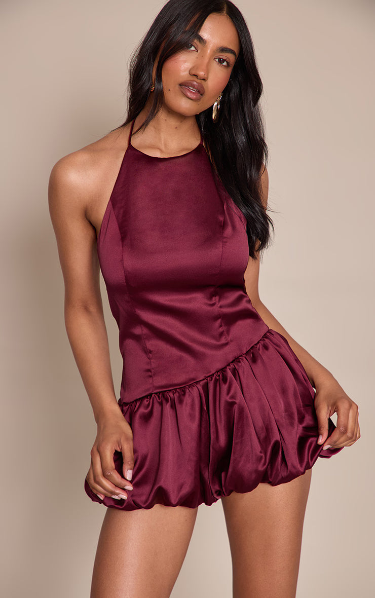 Make a playful statement with the plum satin halterneck puff ball romper. Crafted from a glossy satin fabric in a rich plum tone, this romper features a halterneck design and voluminous puffball shorts. Style with barely-there heels and bold earrings for a standout evening look.