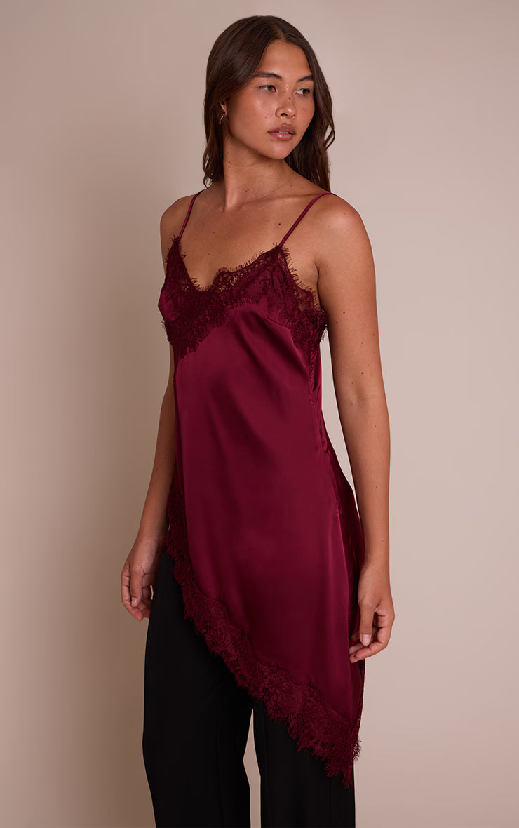 Redefine your evening look with an edge of artful romance. The plum satin lace detail asymmetric long top is a masterclass in understated elegance; its deep plum color is enriched by intricate lace tracing the V-neckline and dynamically shaping the asymmetric hem, offering a modern twist on classic cami styling. Channel confident sophistication by teaming this piece with sleek tailored pants and the sharp lines of mid calf boots. A minimalist black bag completes an effortlessly impactful aesthetic, ensuring you're ready for any after-dark moment.