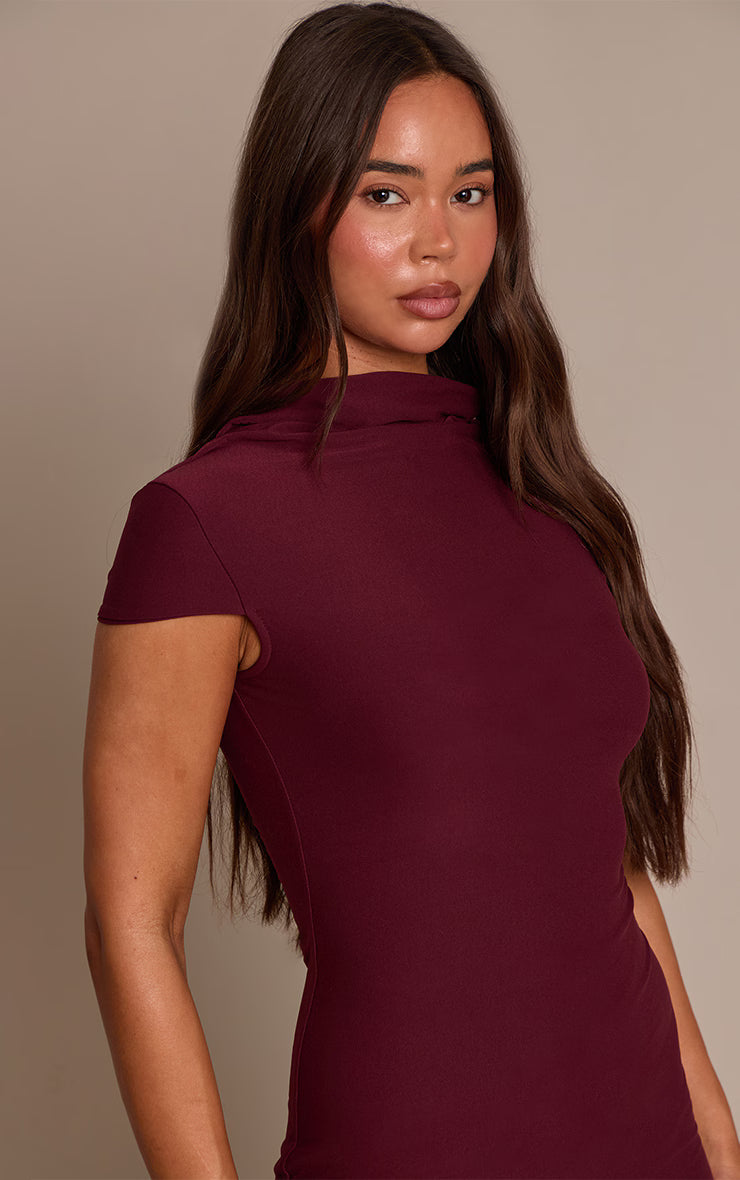 The plum soft touch high neck cowl bodycon dress is cozy yet figure-enhancing with a draped cowl neck and fitted silhouette. Its soft fabric keeps it luxe and comfortable. Style with heeled boots and a statement belt for an evening-ready look or layer under a blazer for casual polish.