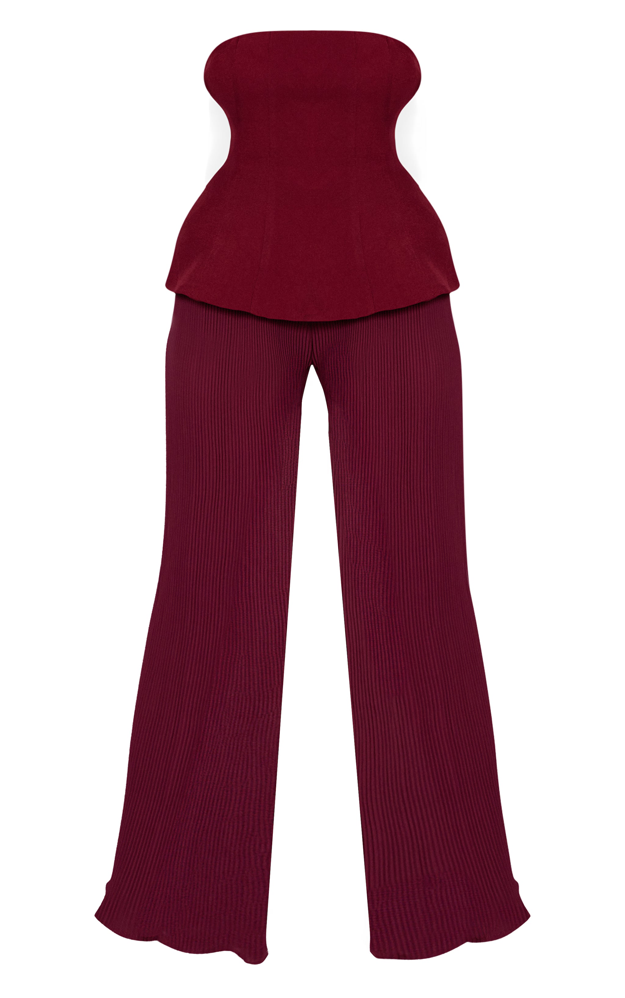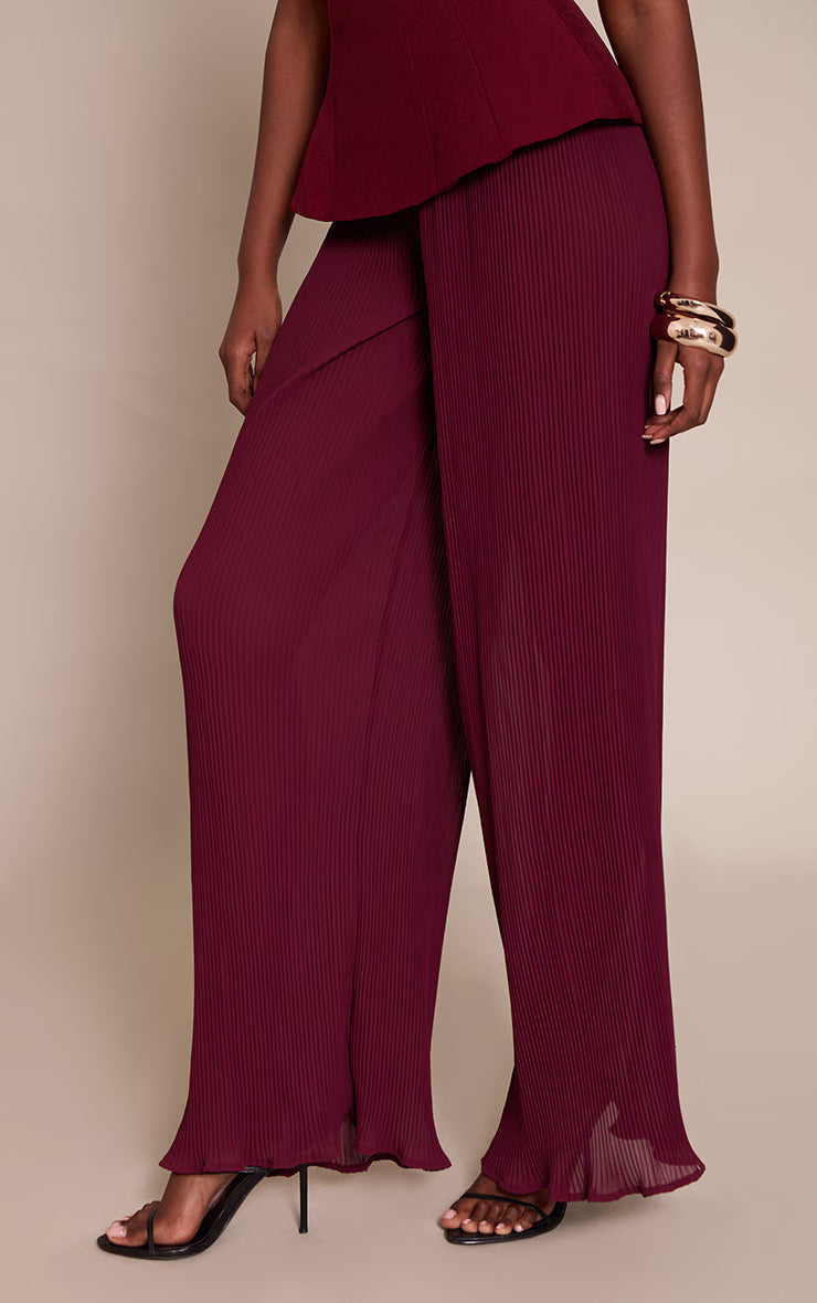 Master your next occasion look with an undeniable statement piece. The plum woven bandeau plisse leg jumpsuit delivers a confident form, shaped with a chic bandeau neckline that elegantly frames the décolletage. Its structured bodice flows into a subtle waist flare, before cascading into dramatic, wide-leg plisse pants that move with fluid grace. For an assured finish, pair this all-in-one design with sleek black kitten heels to complete an elongated silhouette. Refine your aesthetic further with a delicate gold ring and a minimalist clutch bag, curating every detail for subtle yet powerful impact.