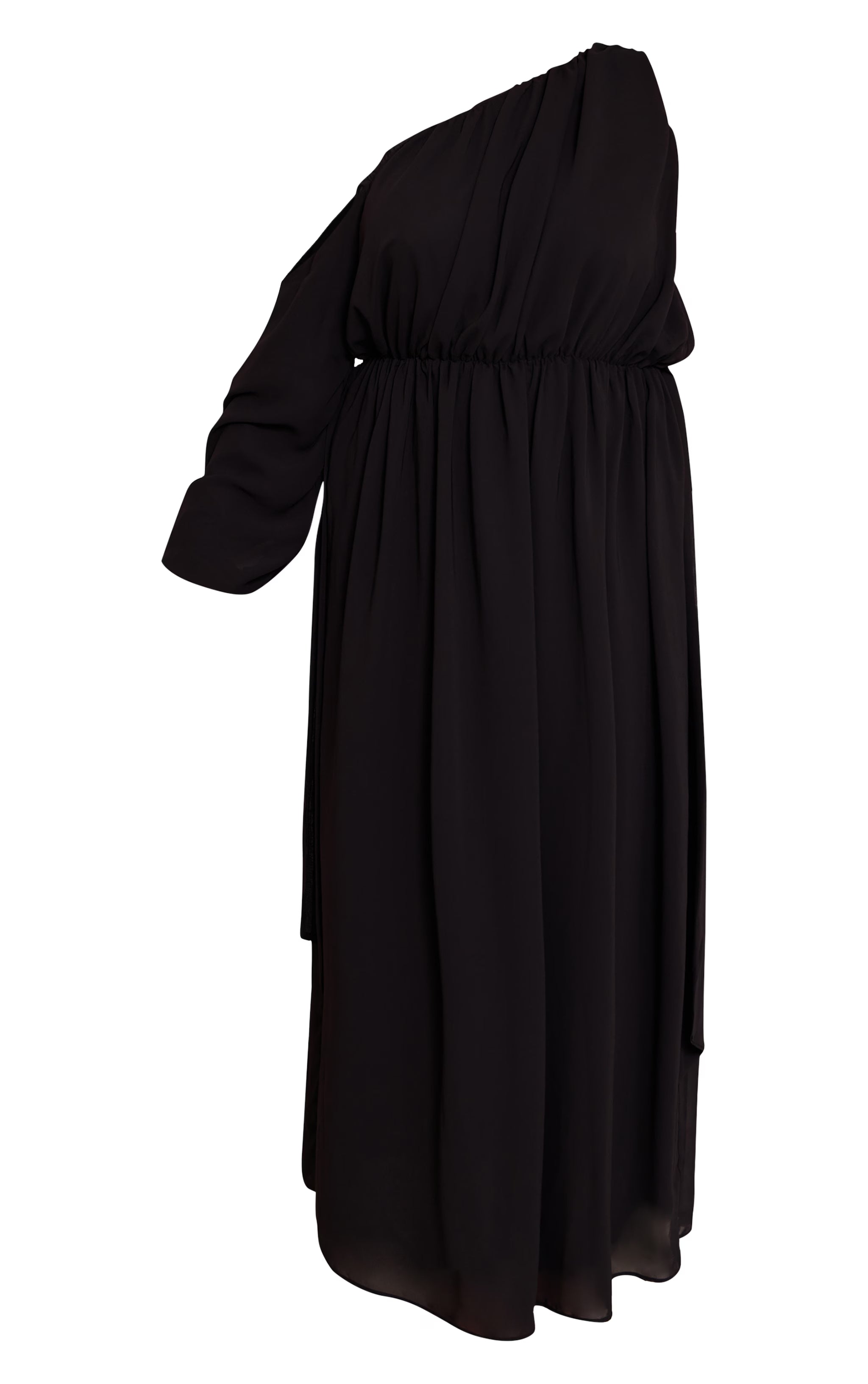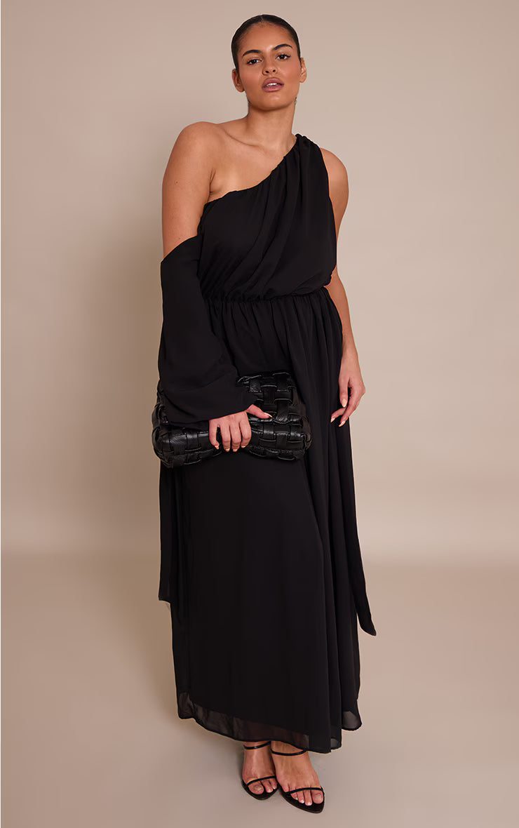 For those moments when only dramatic flair will do, embrace a look that speaks volumes. The plus black chiffon drape long sleeve maxi dress commands attention with its striking asymmetric one-shoulder neckline, gracefully draped across the bodice before unfolding into a single voluminous long sleeve. A cinched waist offers definition, flowing into a sweeping maxi skirt that moves with an undeniable presence. Complete the ensemble with sharp ankle boots, a sophisticated black bag, and minimalist gold jewelry for an unforgettable after-dark aesthetic.