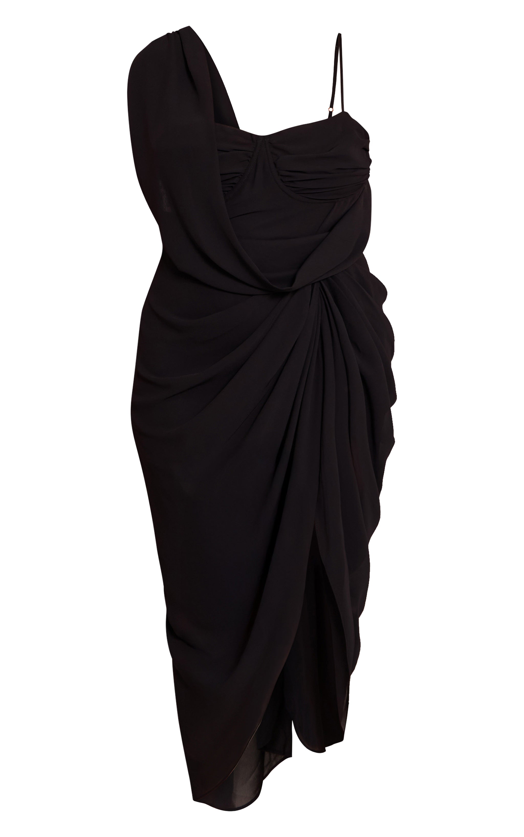 Step into the spotlight with an undeniable presence. The plus black chiffon overlay detail drape midi dress instantly captivates with its artful construction, featuring an asymmetric neckline that blends a delicate spaghetti strap with a dramatic, draped chiffon shoulder. The bodice is softly ruched to a defined waist, from which a daring side slit emerges from elegant draping, creating movement and a truly modern silhouette. Elevate this striking piece for evening events by pairing with minimalist stiletto heels and subtle gold stud earrings, ensuring all focus remains on the dress's confident cut for a truly knowing impression.