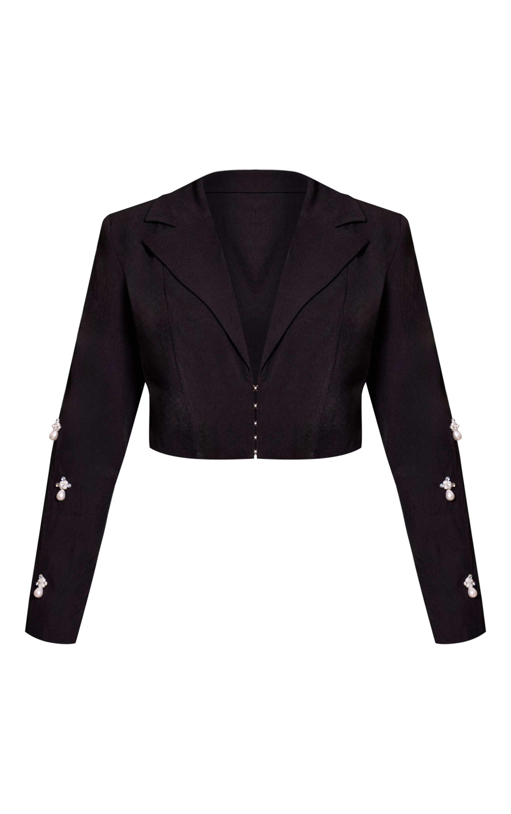 Own the night with a piece that blends sharp tailoring with knowing embellishment. The plus black woven embellished cropped blazer is designed for impact, featuring a sophisticated cropped cut and sharp lapels that frame a confident deep V-neckline, secured with discreet hook-and-eye fastenings. Its long sleeves are adorned with scattered pearl-like details, adding an unexpected edge to the classic black woven finish. Pair this striking blazer with its matching high-waisted pants for a cohesive two piece set, grounding the ensemble with sleek stiletto heels and completing the look with delicate pearl earrings to complement the elegant sleeve adornments. This piece defines refined evening wear for the self-assured.