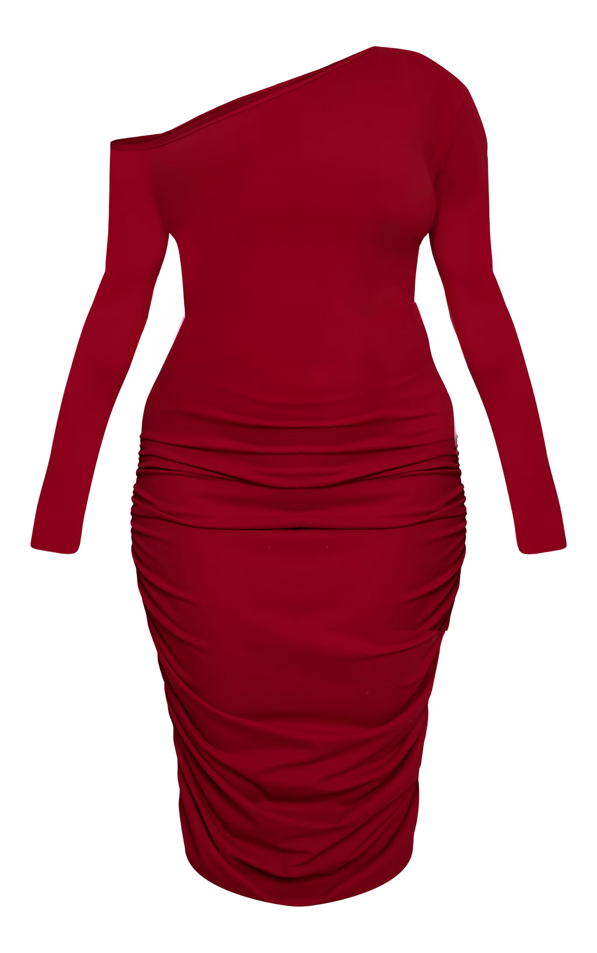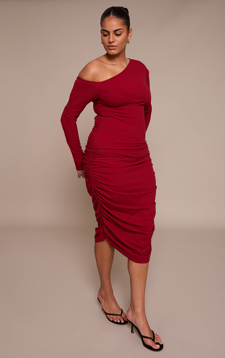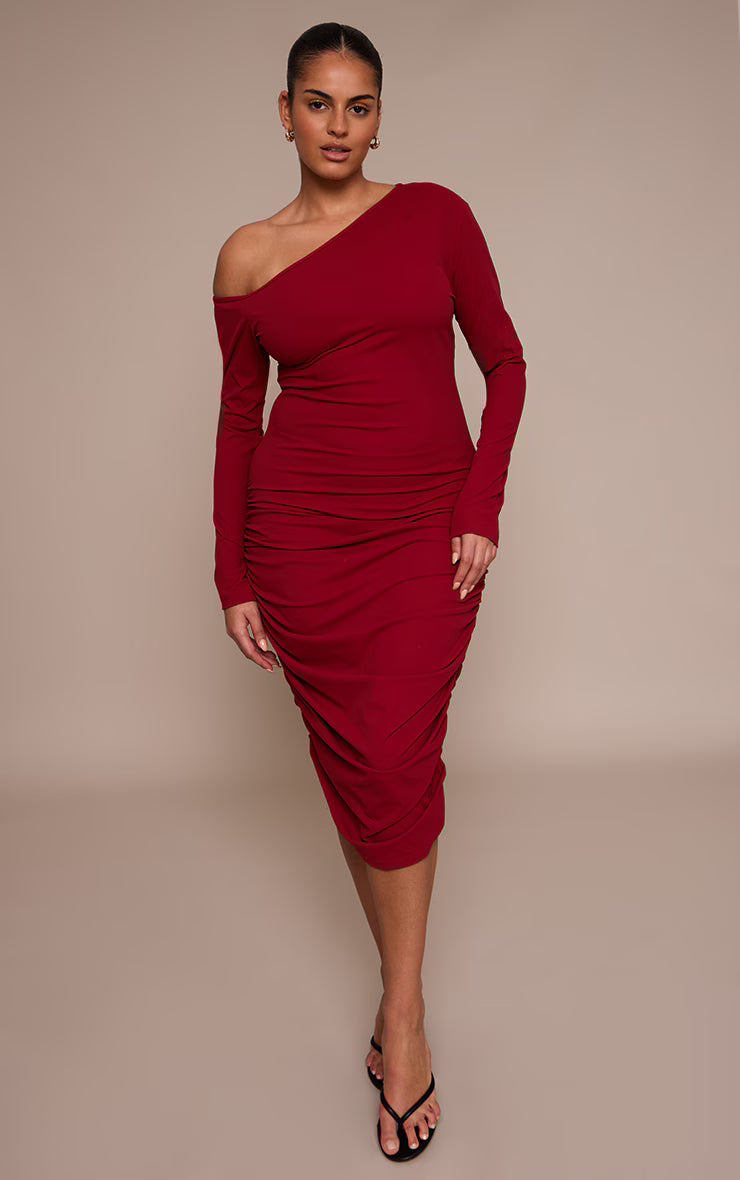 Master the art of sophisticated allure with the plus burgundy sculpt off shoulder ruched midi dress. This bodycon midi boasts an artful off-shoulder neckline, gracefully revealing one shoulder while long sleeves balance the asymmetrical cut. Strategic ruching flows through the body and skirt, meticulously enhancing your shape for a confident and captivating profile. For an evening that demands effortless impact, complete this striking piece with elegant nude heels and a pair of delicate stud earrings, ensuring every detail speaks to a refined aesthetic.