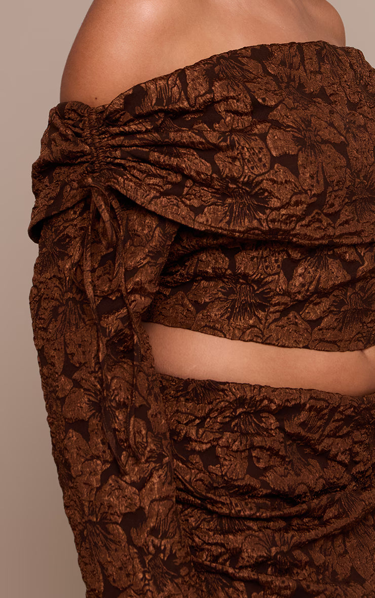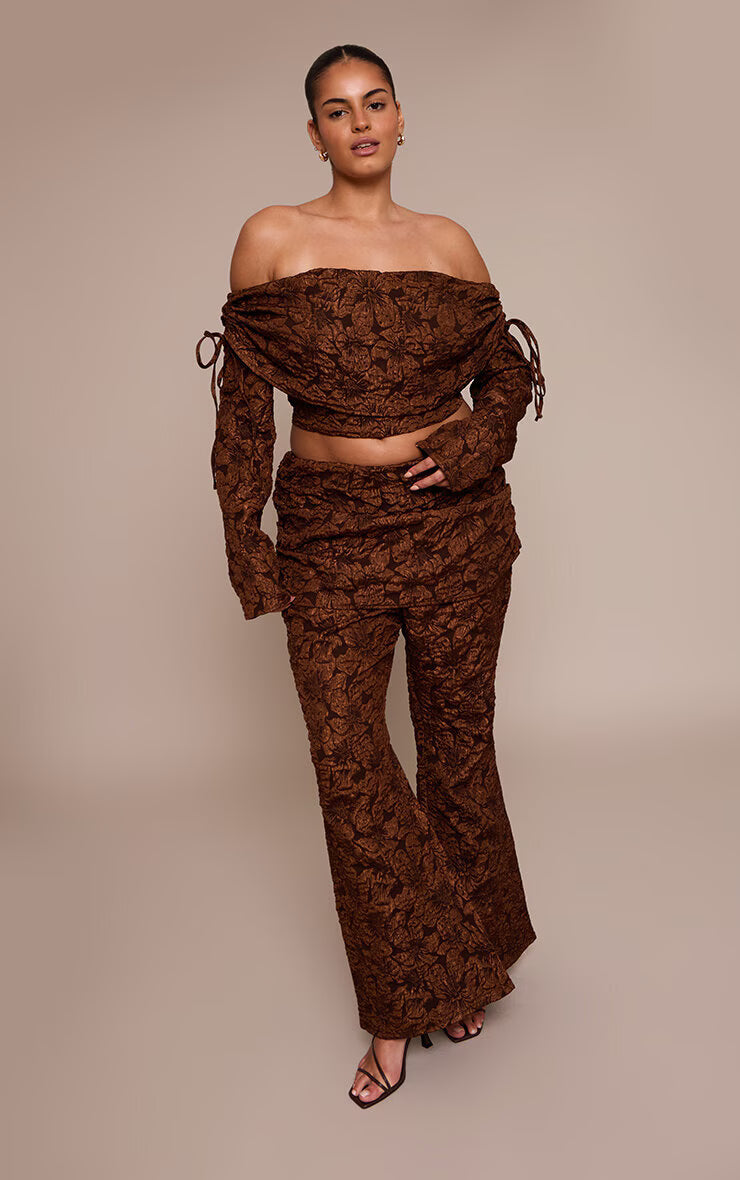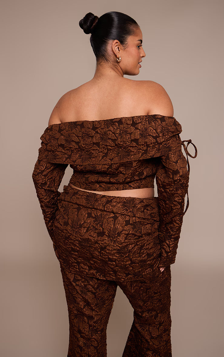 Command the room with a look that speaks volumes, effortlessly. The plus chocolate floral jacquard bardot top delivers an artful aesthetic, featuring an off-the-shoulder neckline that frames the décolletage with confidence. Its rich chocolate hue is elevated by a subtle floral jacquard pattern, while long sleeves with adjustable tie detailing add a chic flourish, finishing with a perfectly cropped hem. Pair this distinctive piece with the coordinating chocolate pants for a cohesive statement, then complete your evening ensemble with some sleek gold heels and a delicate gold ring to heighten the allure.