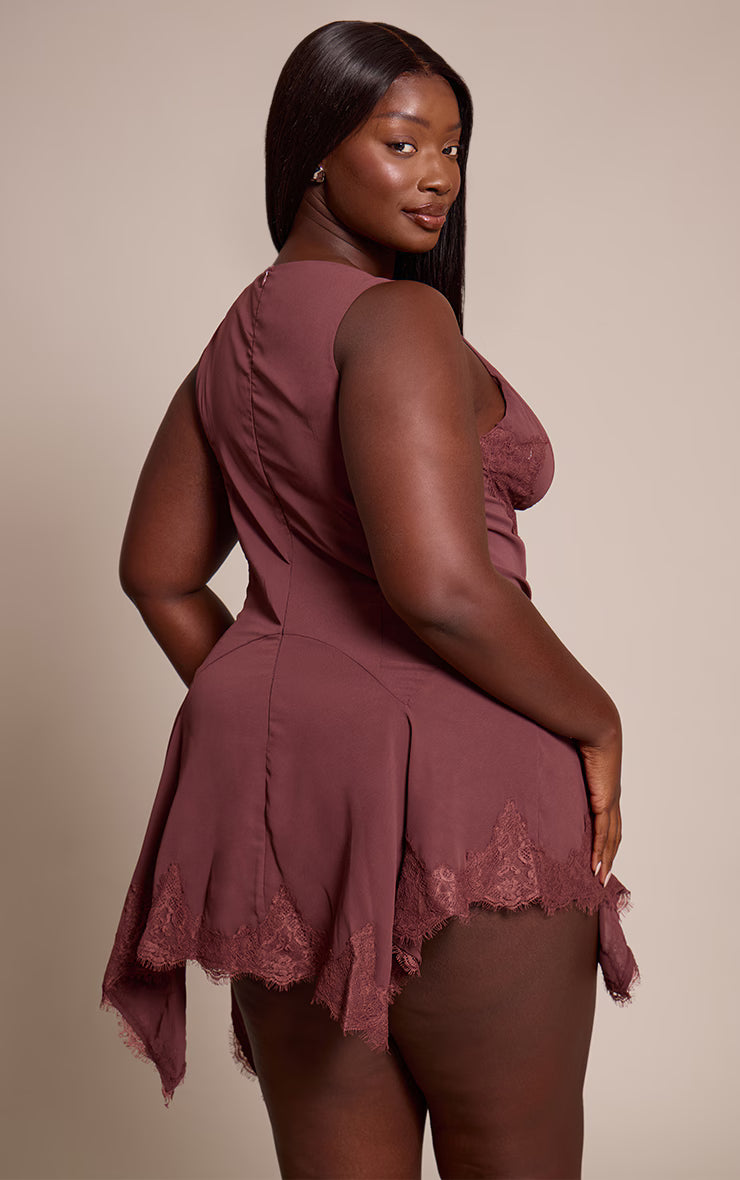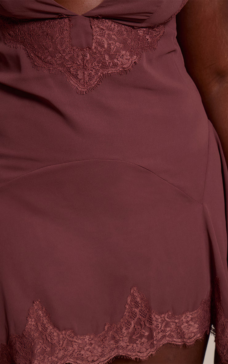 Make a statement in the plus dark plum lace trim plunge bodycon dress. Made from a dark plum material, it features lace trim accents, a plunge neckline, and a fitted bodycon silhouette for sultry appeal. Style with kitten heels and gold accessories for evening glamour.