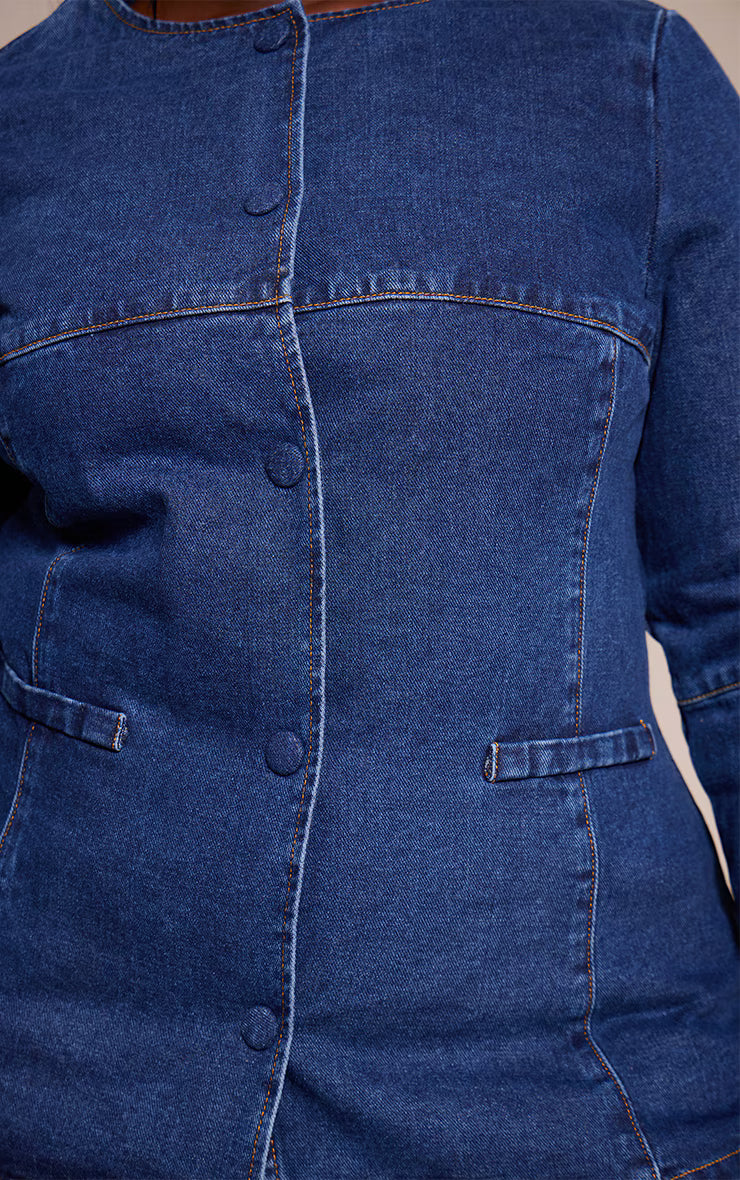 Step into a refined denim aesthetic that commands attention with effortless ease. This plus denim round neck shirt, in a versatile mid blue wash, redefines day dressing with its artfully structured silhouette. It features a clean round neckline, a full button-front fastening, and thoughtful panel detailing that creates a subtle, flattering peplum-style flare, complete with discreet front pockets for a polished finish. Pair this contemporary piece with the matching denim two piece set bottoms for a cohesive statement, or contrast with tailored wide-leg pants for an unexpected edge. Complete your look with sleek black heels to elevate the ensemble, adding a minimalist gold ring for an understated yet powerful aesthetic.