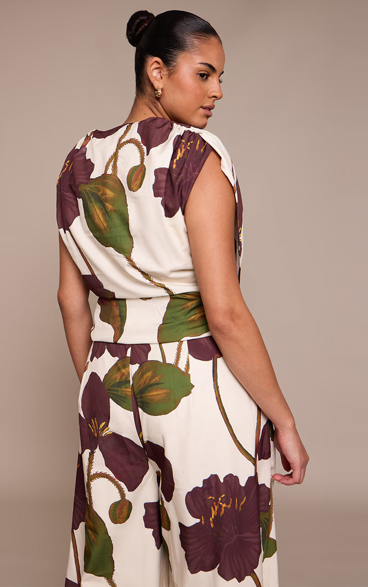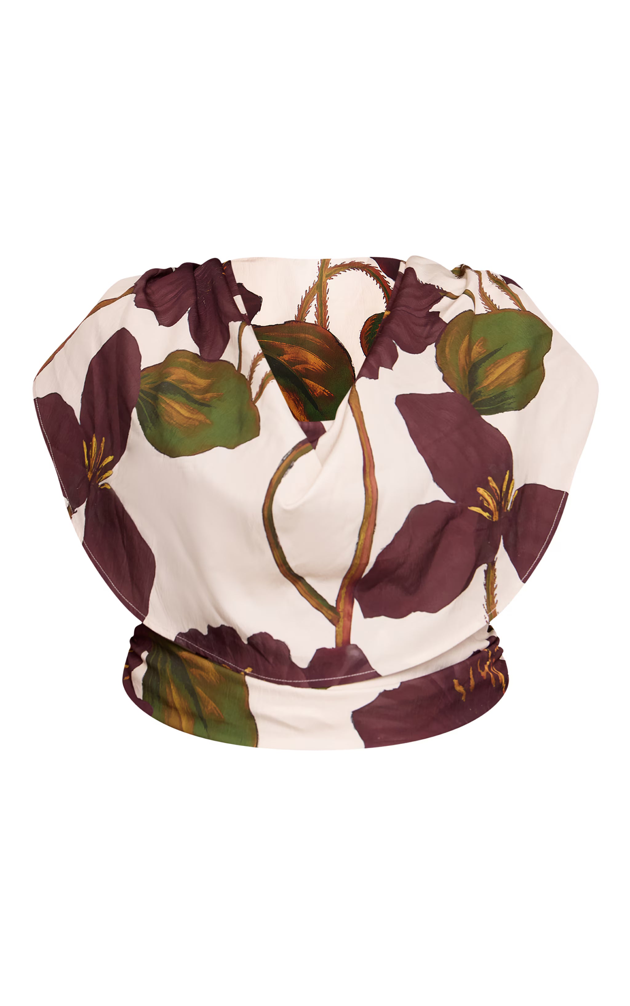 Inject modern artistry into your evening wardrobe with the plus floral print woven ruched shoulder cowl neck top. Anchored by a statement cream base, this piece showcases a striking dark floral motif, framed by an elegantly draped cowl neckline and subtle ruched detailing at the shoulders. Its contemporary cropped, wrap-front silhouette creates a flattering shape perfect for making an entrance. Pair this distinctive top with high-waisted tailored pants for an assured two piece set aesthetic, stepping into sleek white heels and carrying a minimalist black shoulder bag to complete a look that speaks volumes about your confident style.