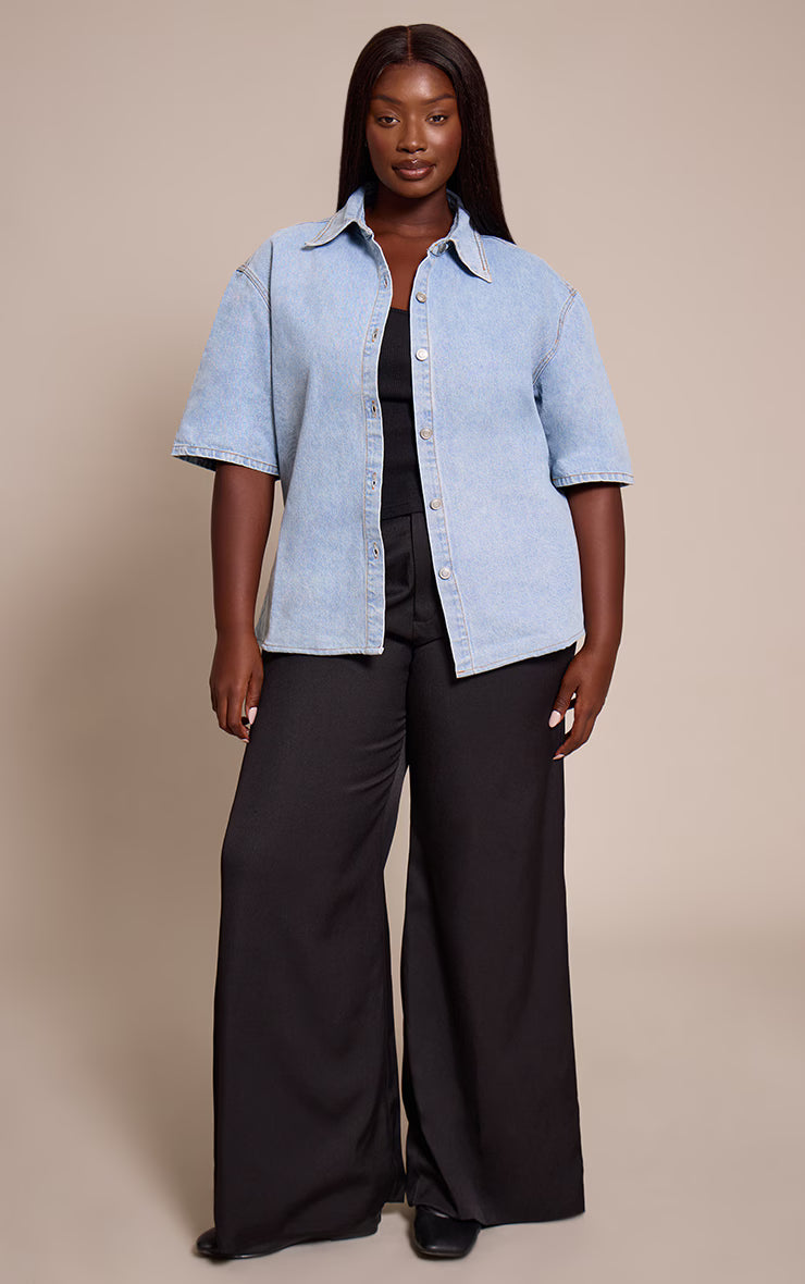 The plus light blue wash fabric covered button detail denim shirt is a fresh twist on a denim classic. Designed in a relaxed cut, it’s elevated by fabric-covered buttons that create a refined finish while keeping the look minimal and clean. Style with matching denim for a tonal two piece set, or layer over a bodycon dress as a lightweight jacket.