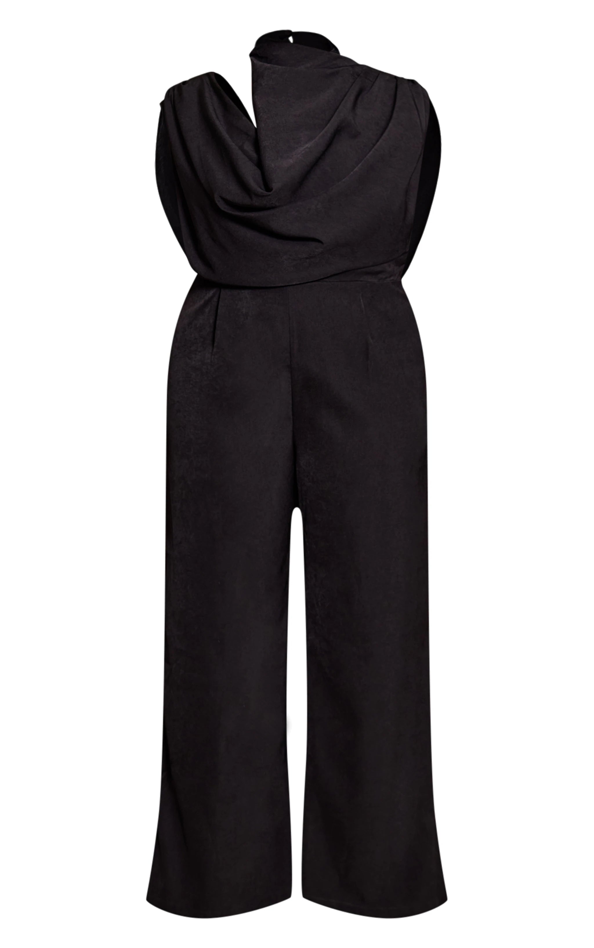 Designed to flatter, the plus premium black woven asymmetric cowl drape back jumpsuit is a plus-size occasionwear essential. Featuring a luxe woven fabric with asymmetric neckline and draped cowl back, this piece balances elegance and structure. Pair with metallic heels and simple accessories.
