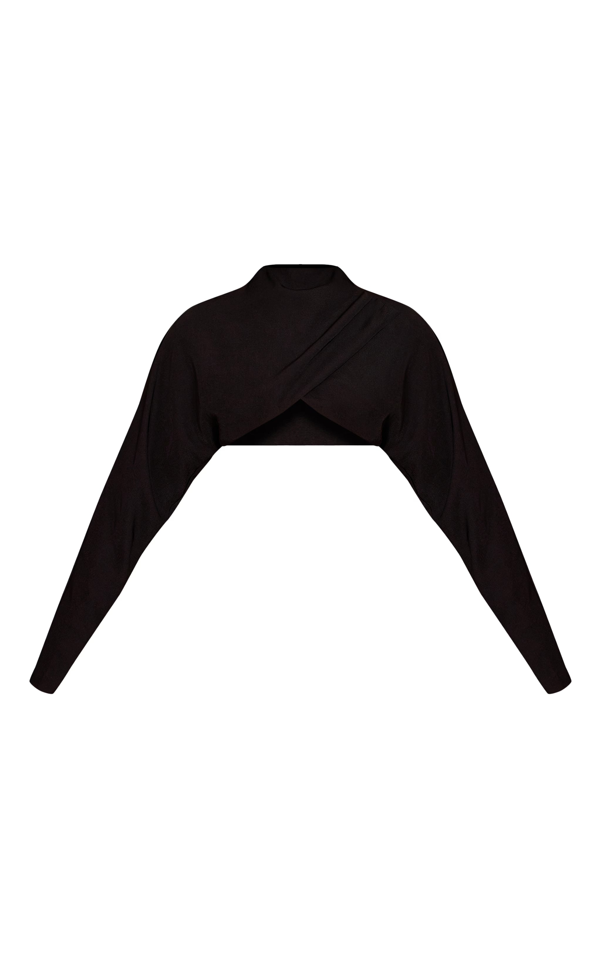 Step into sophistication with the premium black woven crossover long sleeve crop top. Cut from structured woven fabric, this cropped design features a crossover front detail that flatters the waist. Pair with tailored pants and stilettos for an elegant evening outfit.