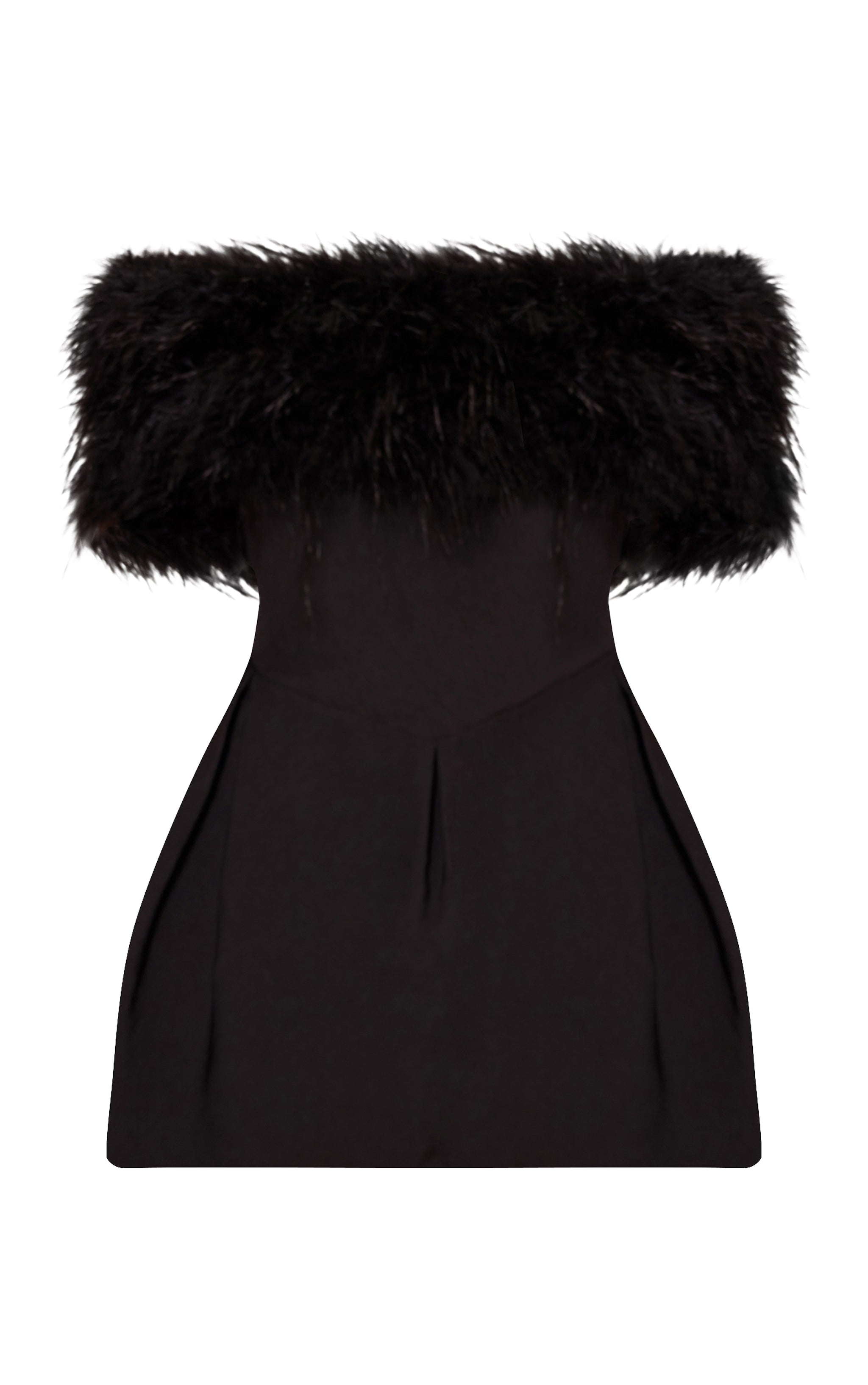 Channel glamour with the premium black woven feather bardot tulip mini dress. Brought to you in woven black fabric, this dress has a feather detail bardot neckline and an elegant mini length fit. Pair with strappy heels and drop earrings for elevated chic.