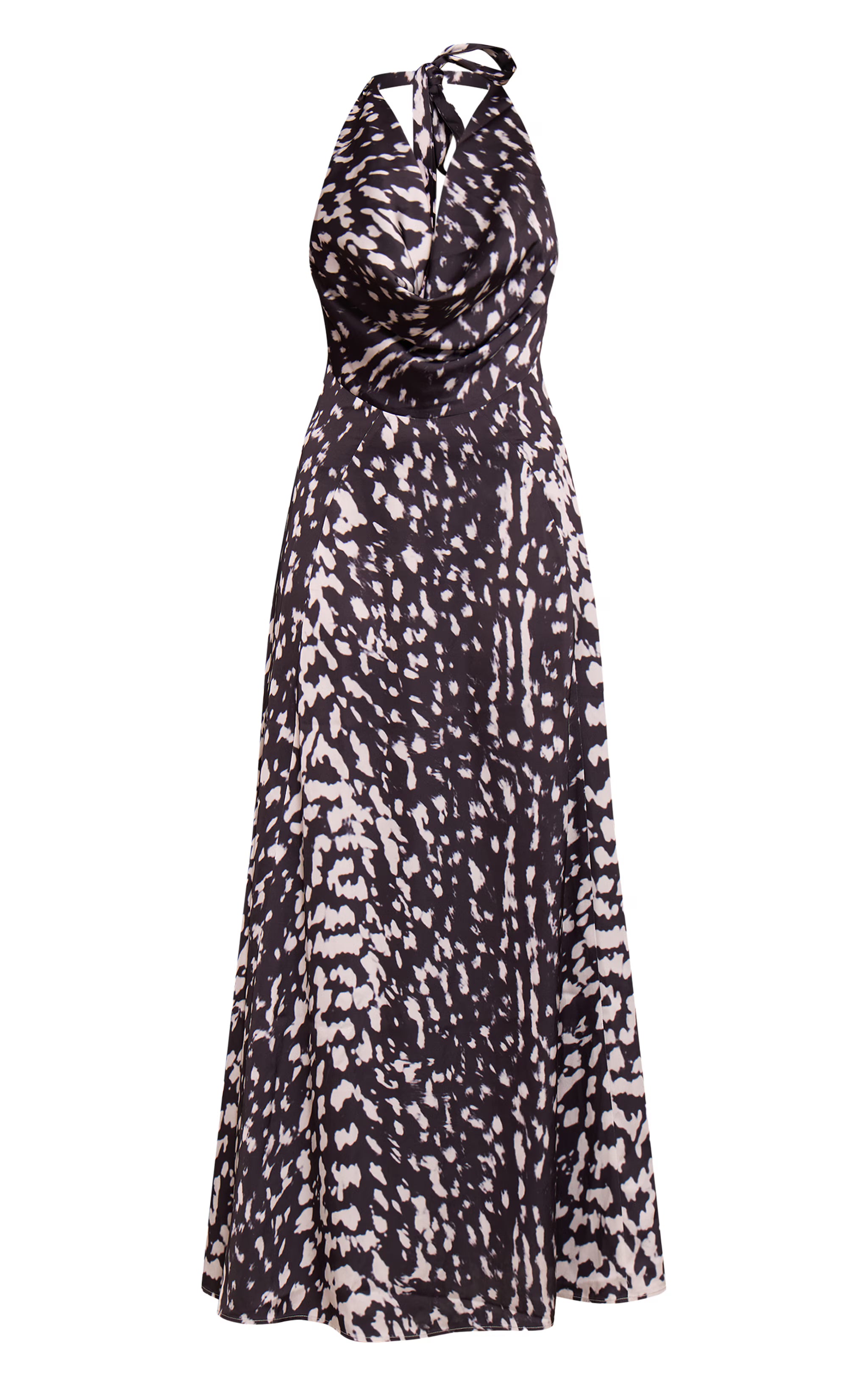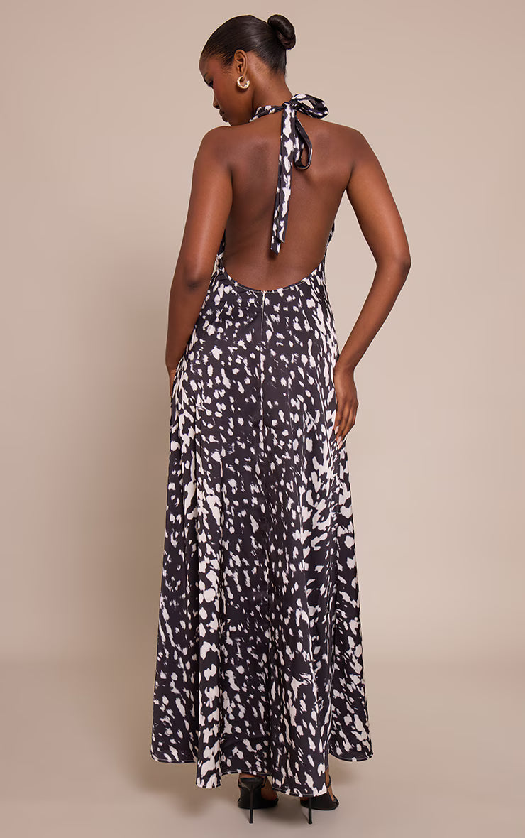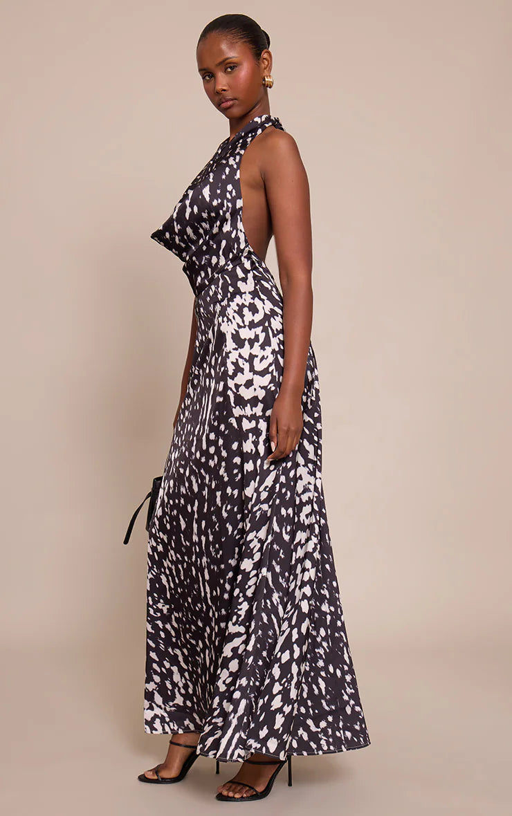 Demand attention without saying a word, arriving in the printed satin cowl neck maxi dress. This artful black and white abstract print piece features a confident halterneck that flows into a deep, elegantly draped cowl neckline, setting a distinctive tone for your evening. Its sleek silhouette cascades to a maxi length, ensuring an impactful presence for any occasion. Complete your look with striking platform heels and polished gold earrings, curating an aesthetic that is both self-aware and undeniably captivating.