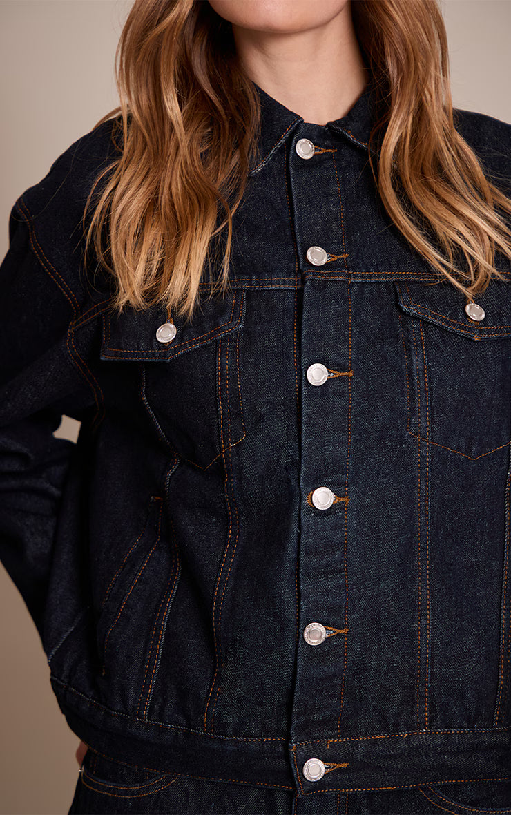 Denim redefined for your everyday wardrobe. The raw indigo oversized classic denim jacket brings an essential, confident edge with its deep, unwashed hue and deliberately relaxed fit, showcasing classic button-front fastening, dual chest pockets, and practical side pockets, all accented by clean contrast stitching and bright silver-tone hardware. Layer this versatile piece over a crisp white tee and straight-leg pants, perfecting the look with a pair of sleek cowboy boots and delicate gold jewelry for an effortlessly put-together ensemble that owns the day.