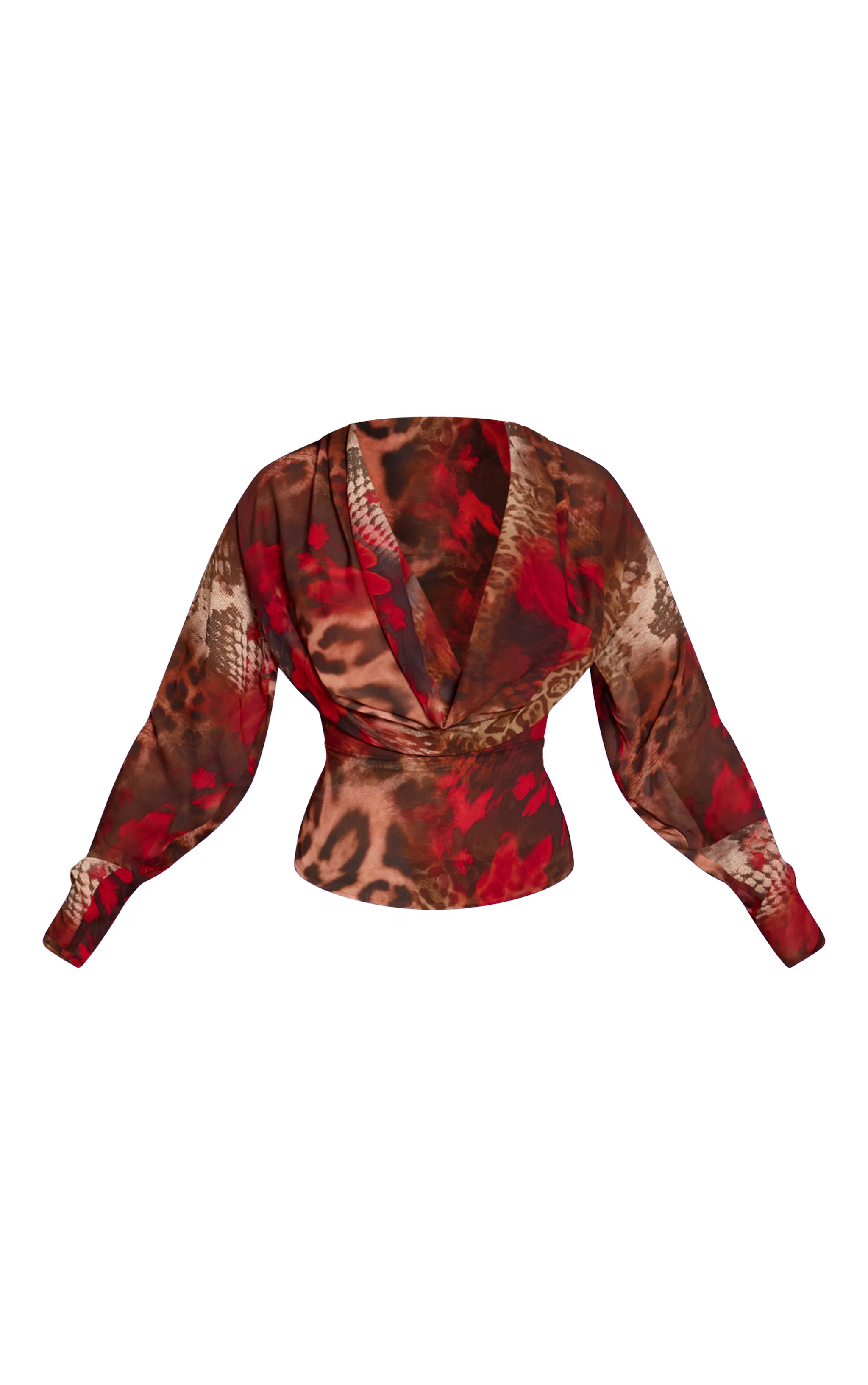 Unleash your confident aesthetic with a piece that blends bold artistry and sleek form; the red printed chiffon cowl neck long sleeve blouse is your definitive choice for evening. Its distinctive red print, a captivating mix of abstract and subtle animal motifs, defines the confident appeal, while the elegant cowl neckline drapes effortlessly. The long sleeves with their neatly cuffed wrists add a refined finish, complementing the artfully cinched, wrap-effect waist that sculpts a flattering line. Pair this dynamic blouse with tailored black pants and statement black heels to perfect your after-dark ensemble, completing the look with subtle pearl earrings for an understated yet polished edge.