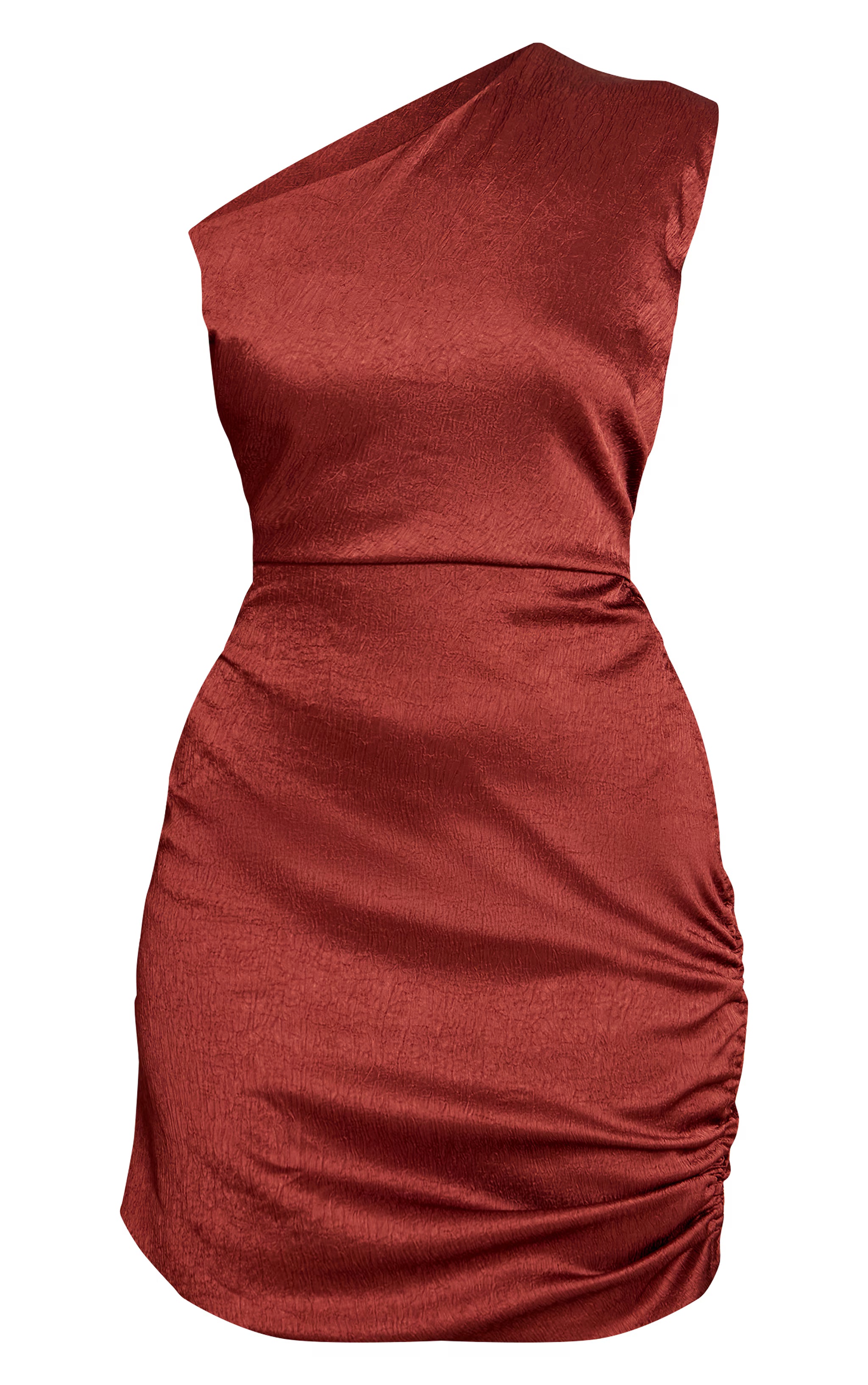 Command attention with the rust satin one shoulder ruched mini dress, designed to sculpt your silhouette for evening occasions. This piece features an artful one-shoulder neckline and striking ruched detailing down the side, creating an undeniably chic and body-contouring shape. Elevate this statement dress by styling it with statement rings and stepping out in elegant mule heels for a look that speaks pure confidence.