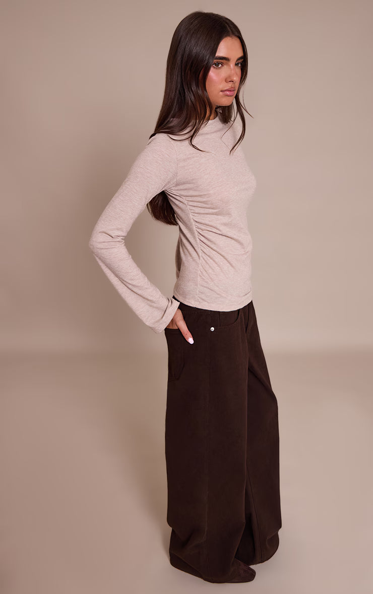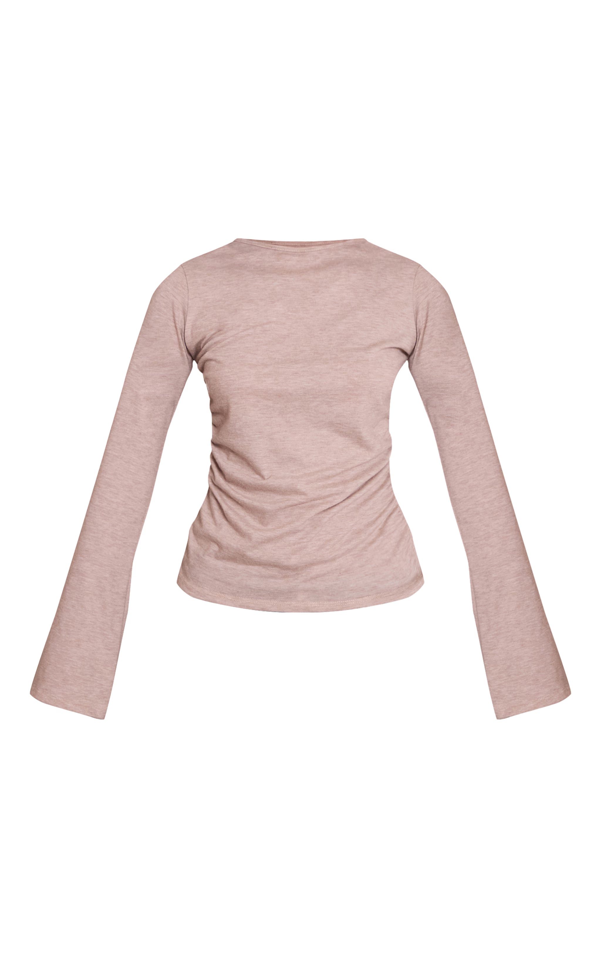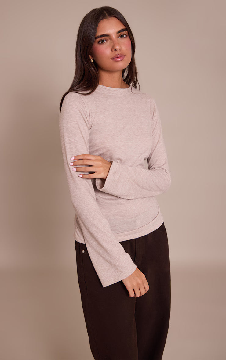 Redefine your core wardrobe with a top that marries subtle detail with effortless wear. The sand marl soft jersey v neck flared long sleeve top introduces impactful simplicity, featuring a gentle v neckline and long sleeves that subtly flare at the cuffs. Artful ruching along the side creates a refined contour, adding visual interest without overpowering the clean aesthetic. Pair this versatile piece with tailored wide-leg pants for a confident daytime look, completing the ensemble with sleek knee high boots. A selection of layered necklaces will naturally enhance the v neckline, affirming an aesthetic that's both knowing and entirely your own.